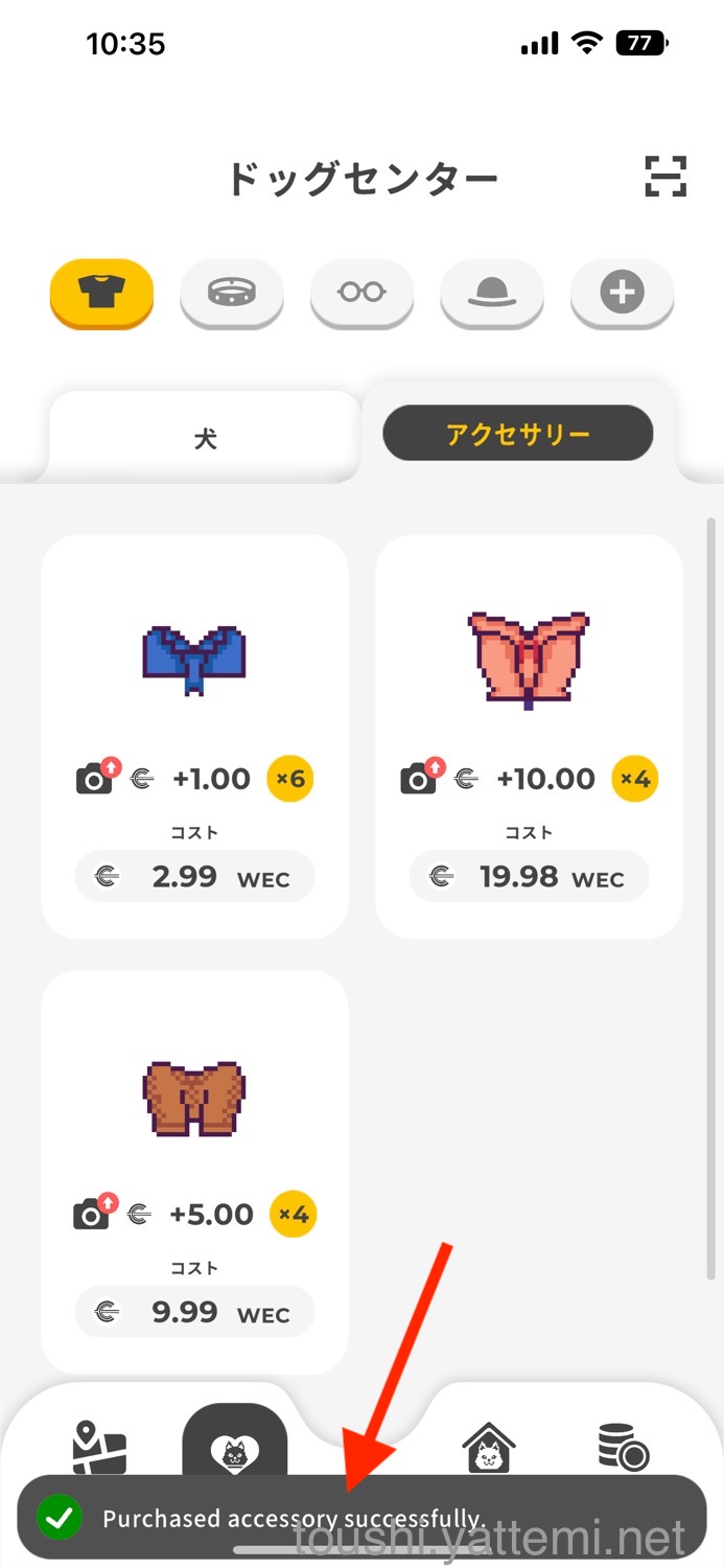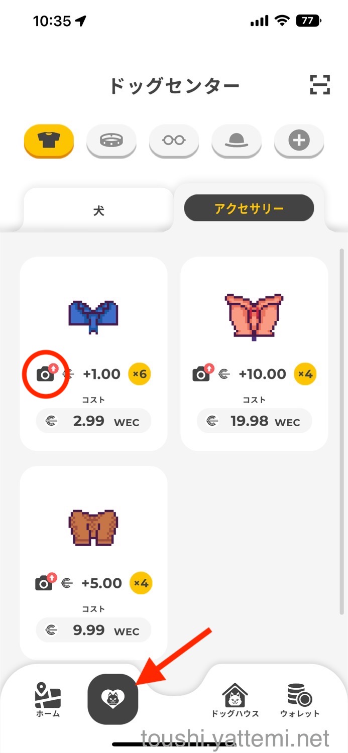 早速「ドッグセンター(下の画像の赤矢印)」にある「アクセサリー」タブを見てみました。