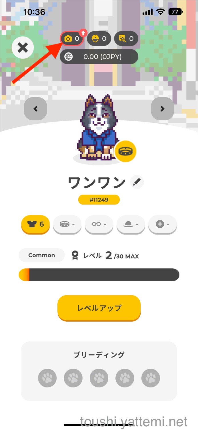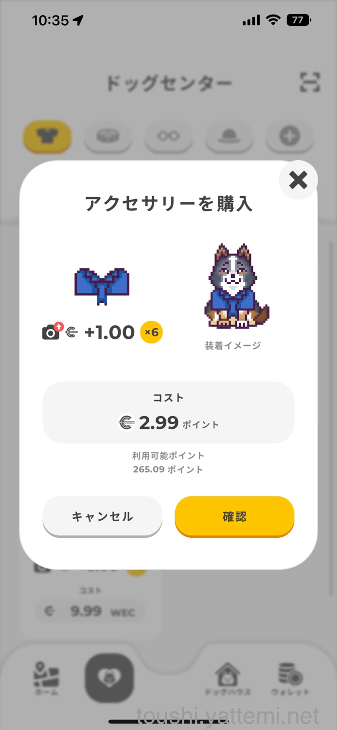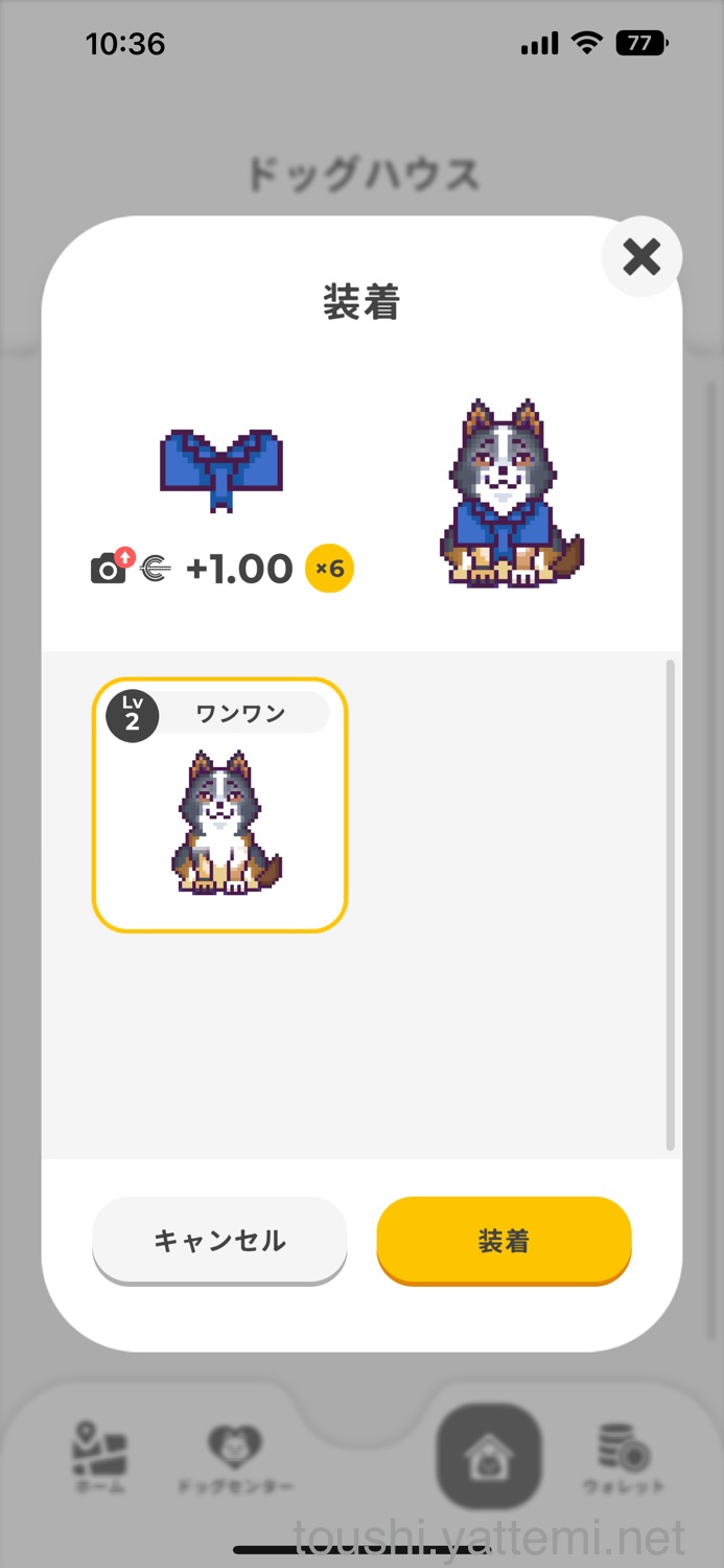 ドッグハウスの「犬」タブに移動して、「相棒犬」の詳細を見てみると、ちゃんと青い服を来ていました。