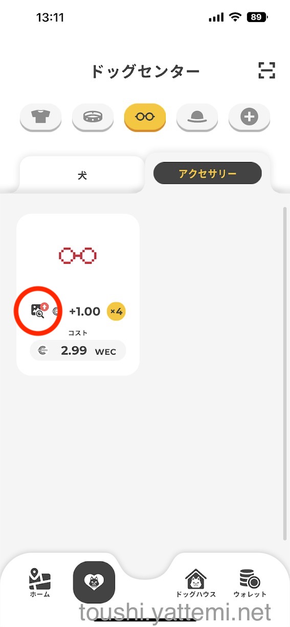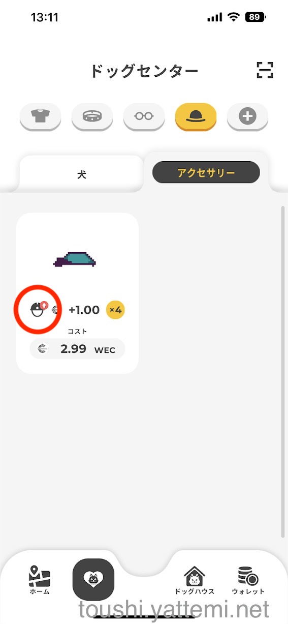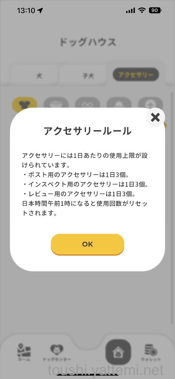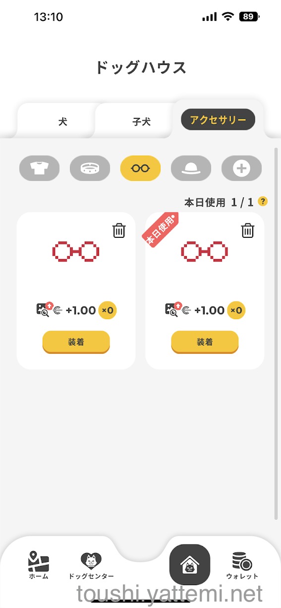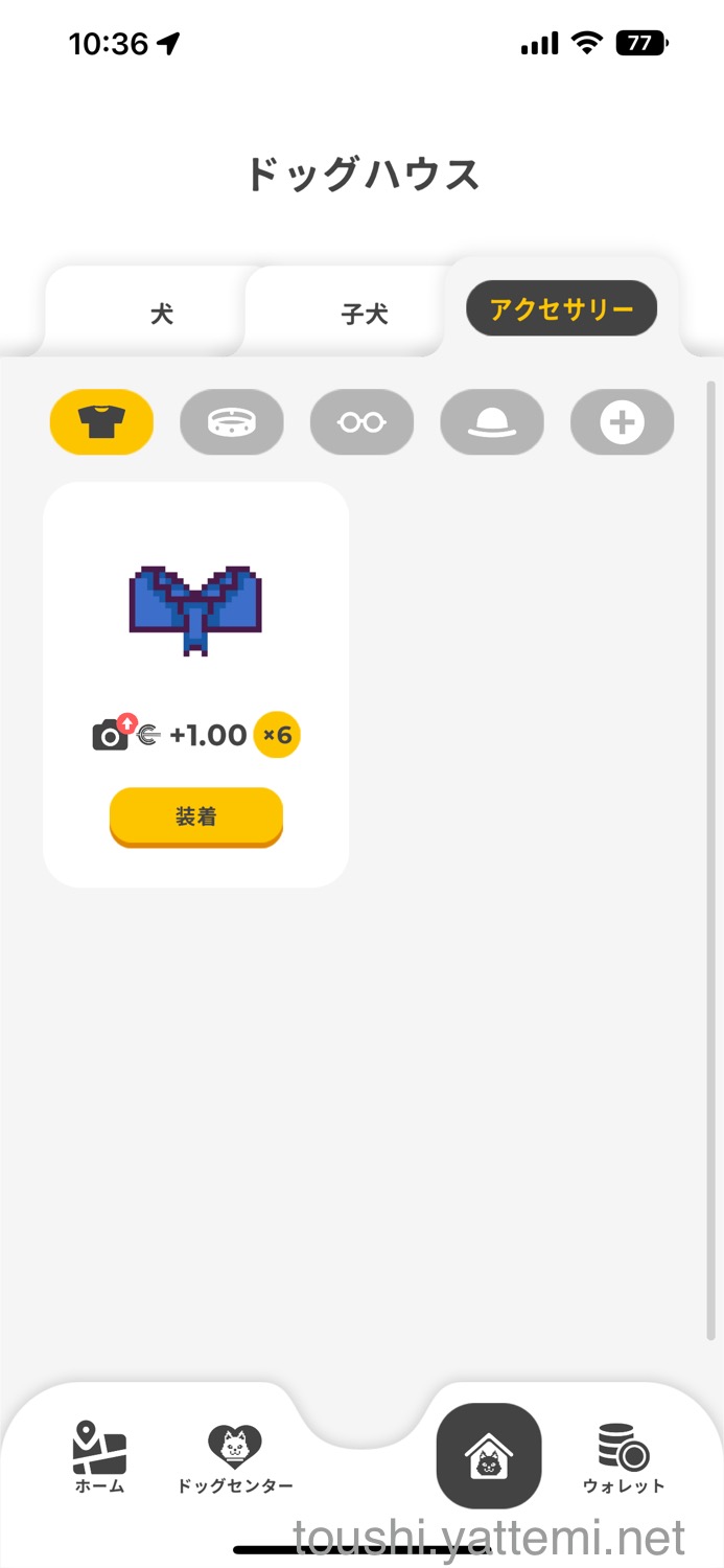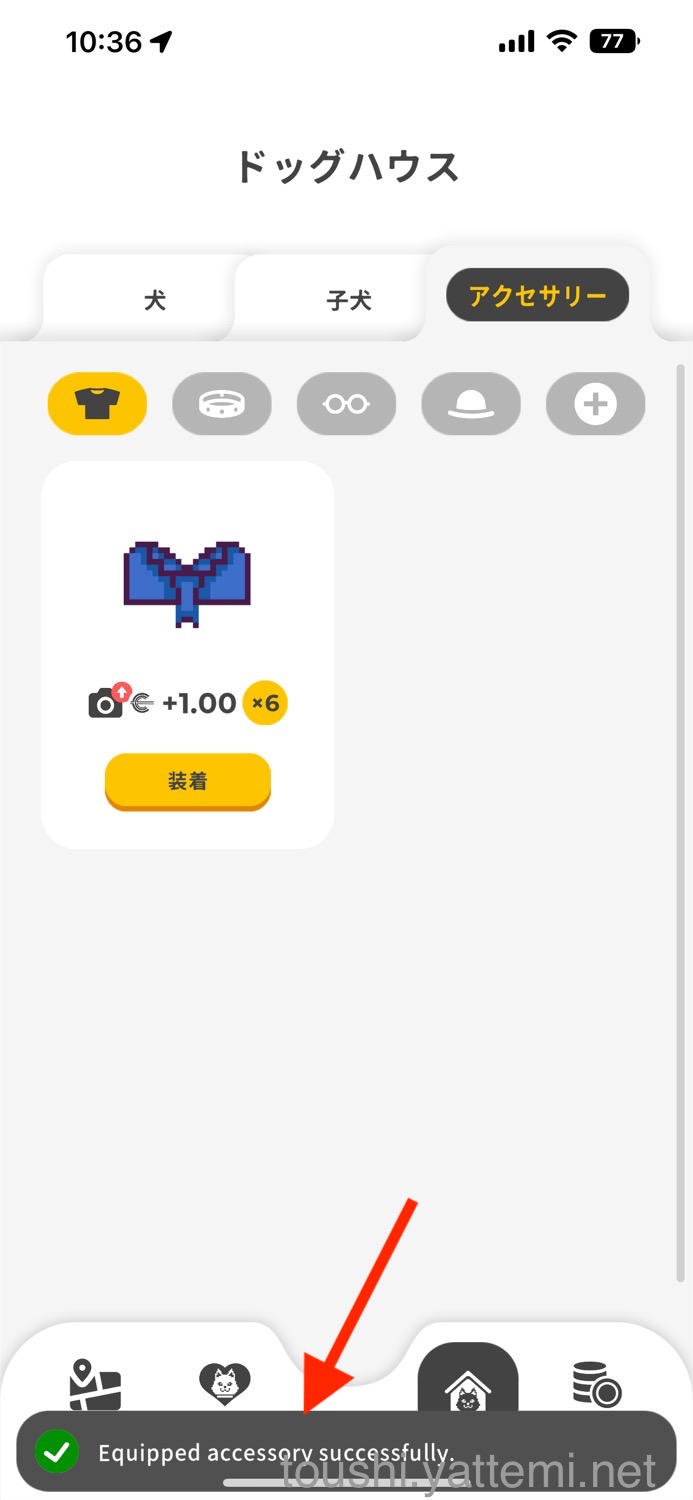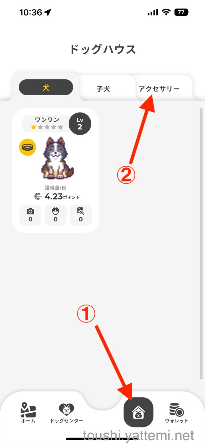 アプリ画面の一番下にある「ドッグハウス(下記画像①)」をタップして、「アクセサリータブ(下記画像②)」を見てみると、