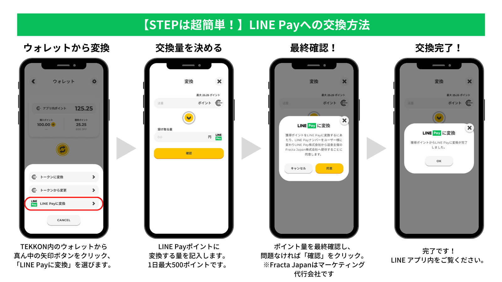 1日500円までなので、2月14日から毎日換金すれば46日あるので、最大23,000円をLINE Payに換金できますね。