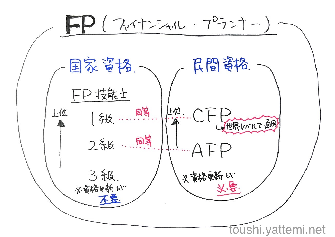 一緒で良くない?!と思ったのですが、さらに調べていくと「AFP」と「CFP」という民間資格もあるので、「FP = FP技能士」ではなくて、「FP = FP技能士、AFP、CFP」となるから違うようですね。