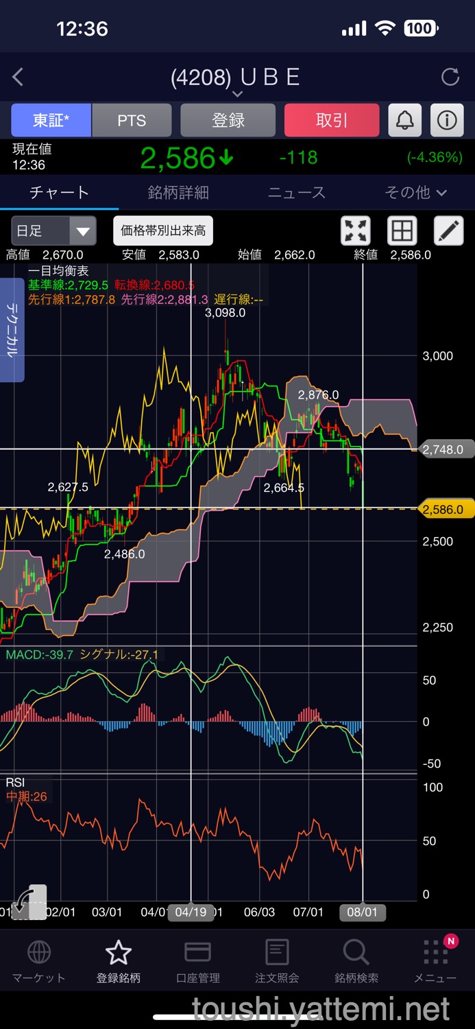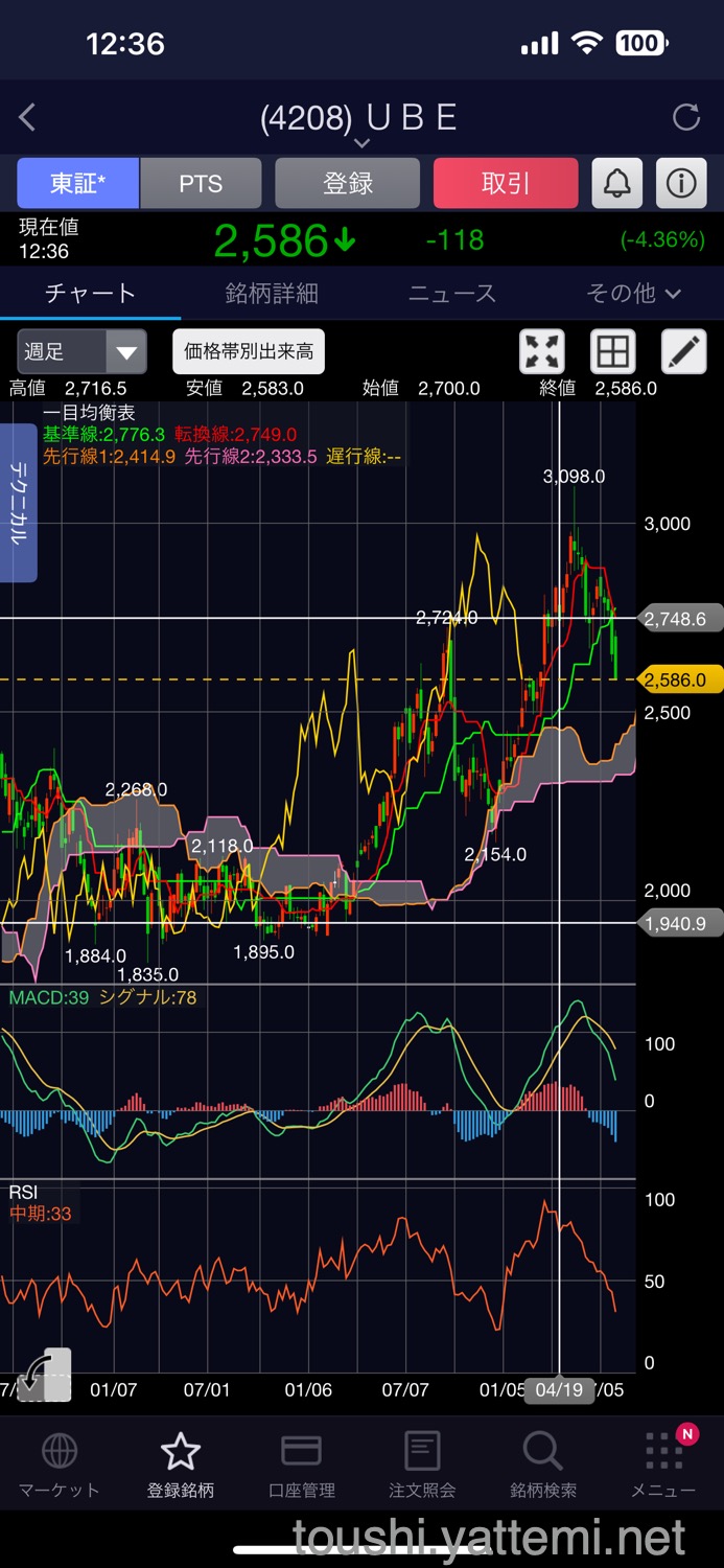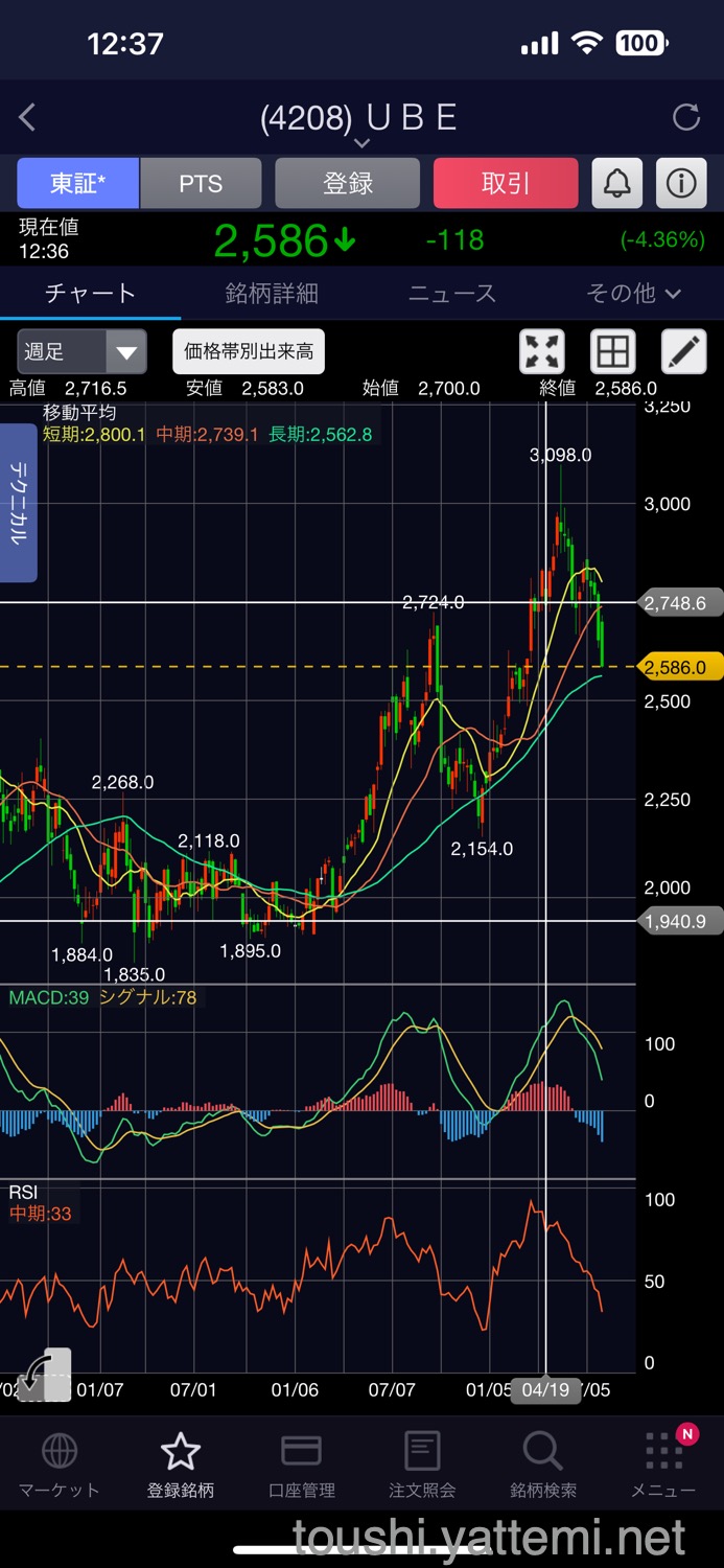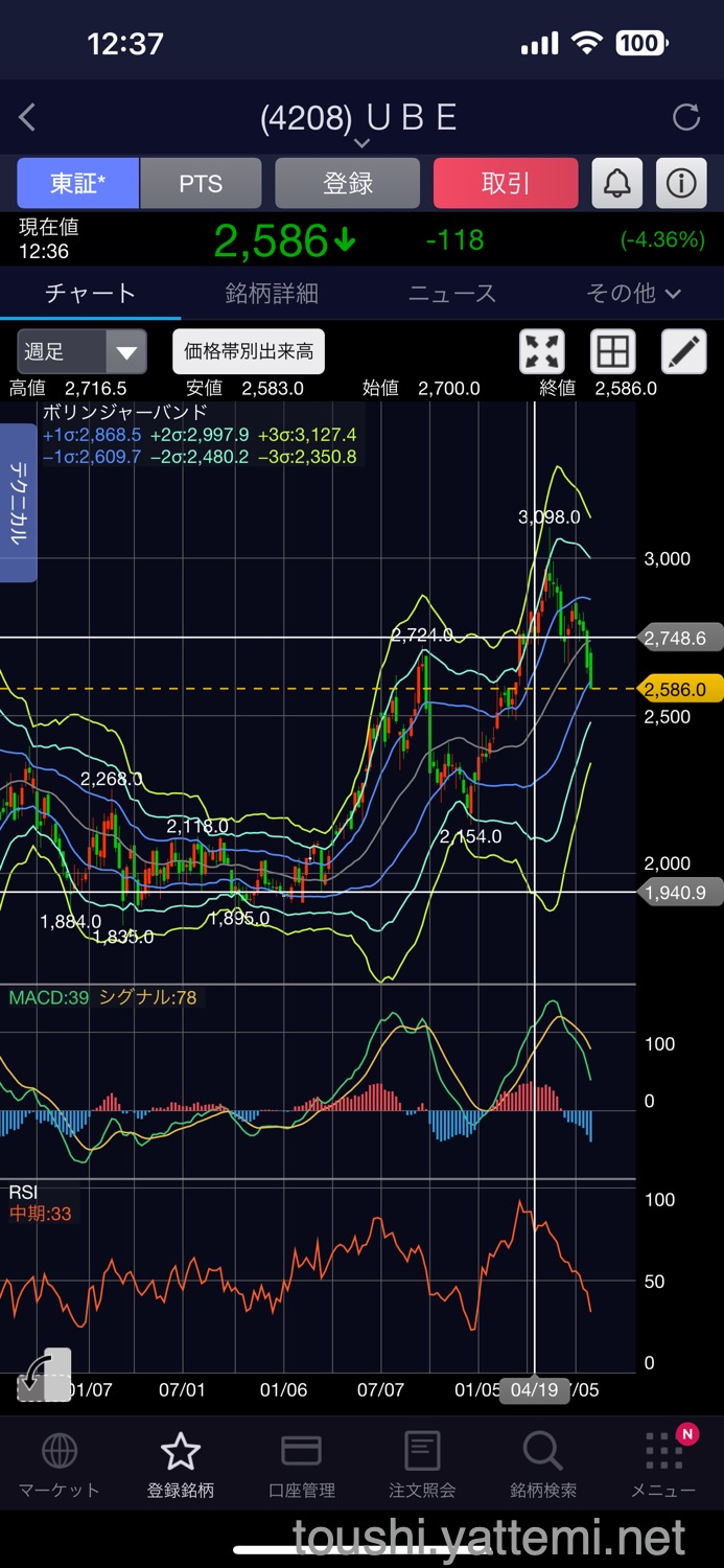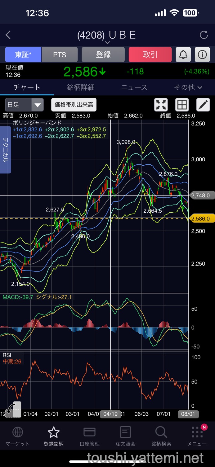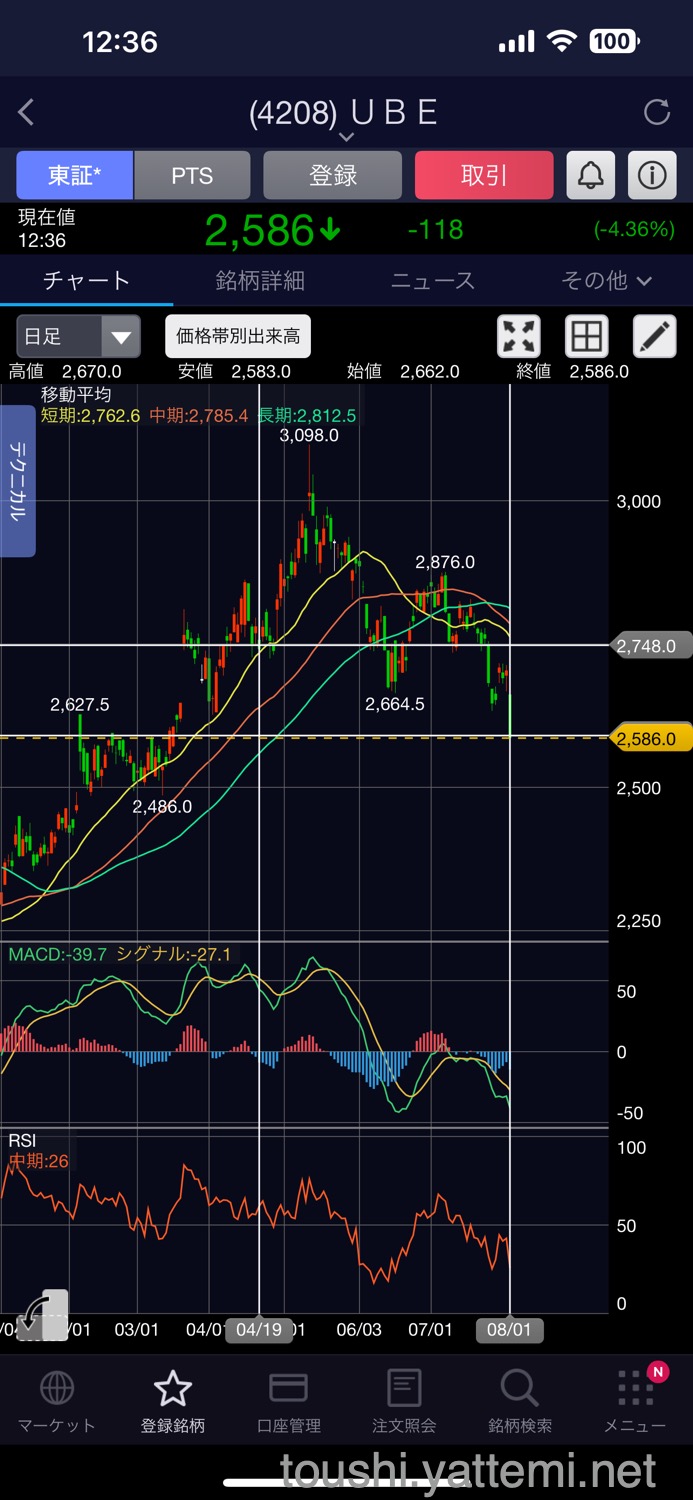 UBE(4208)を2,590円で100株と、ソフトバンク(9434)1,905円で100株購入しました。