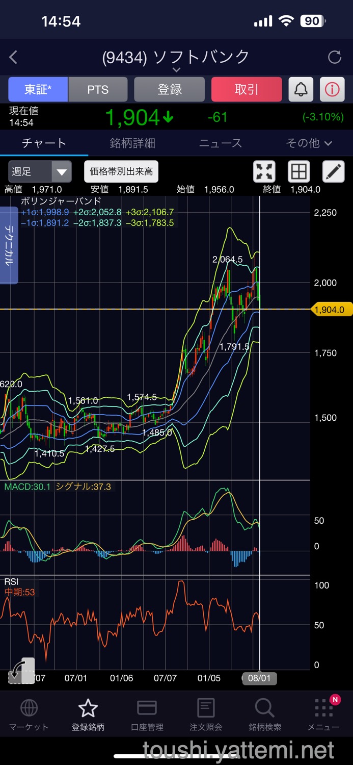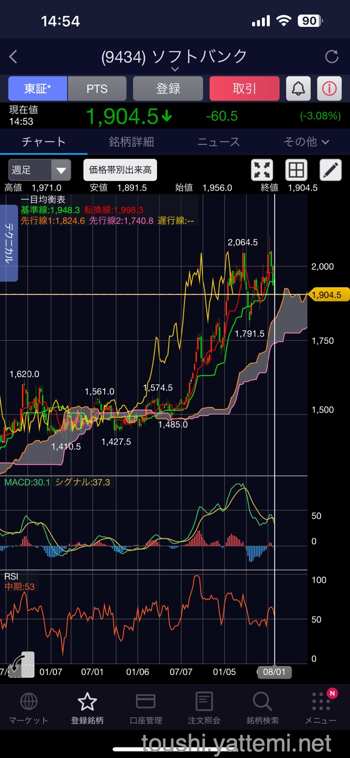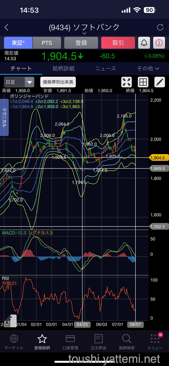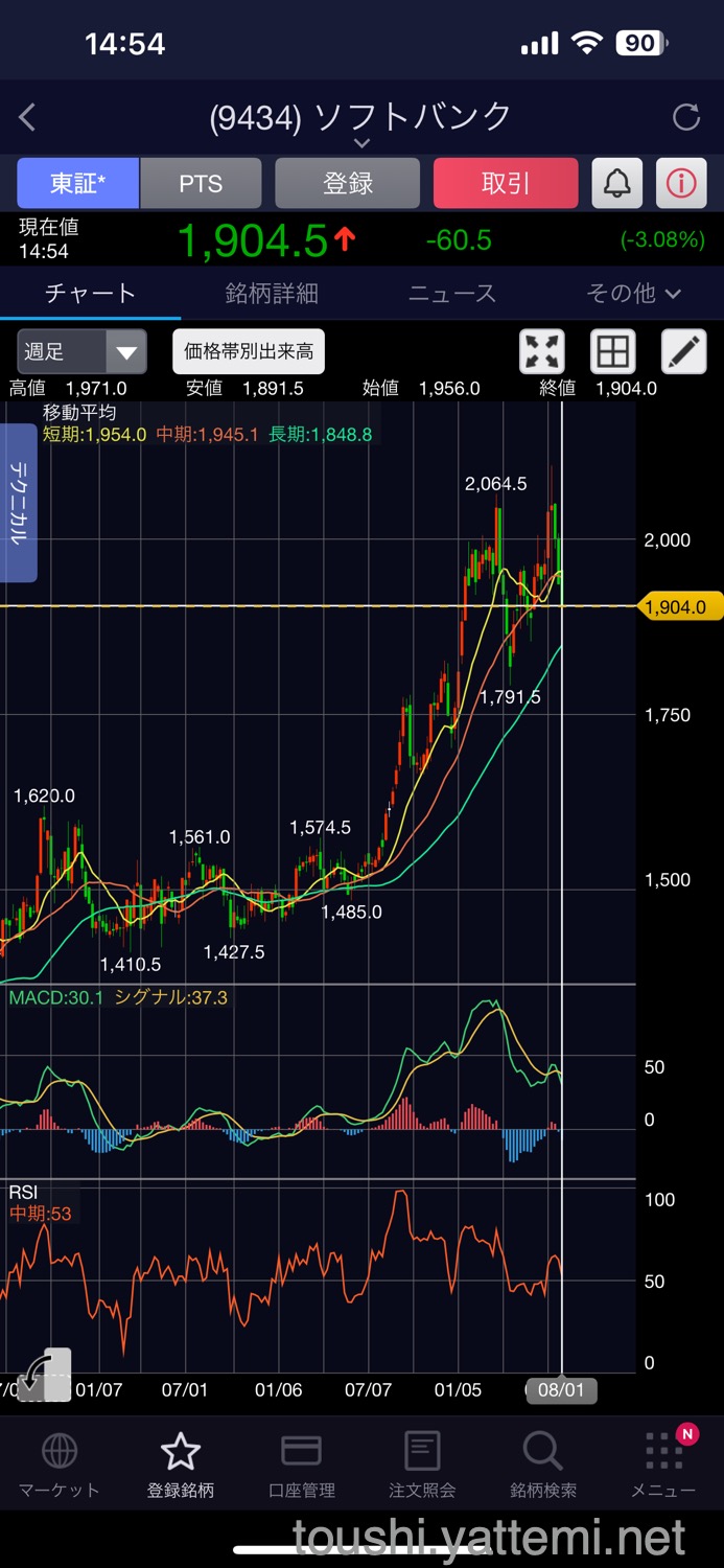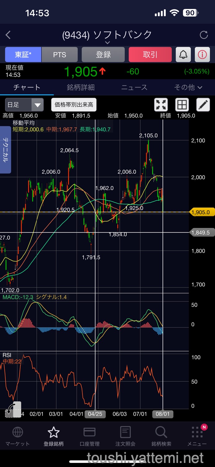 ソフトバンク(9434)は、2024年の9月末に1対10の株式分割が発表されているので、その前に1単元持っておこうと思っていたら大きく下がったので購入しました。
