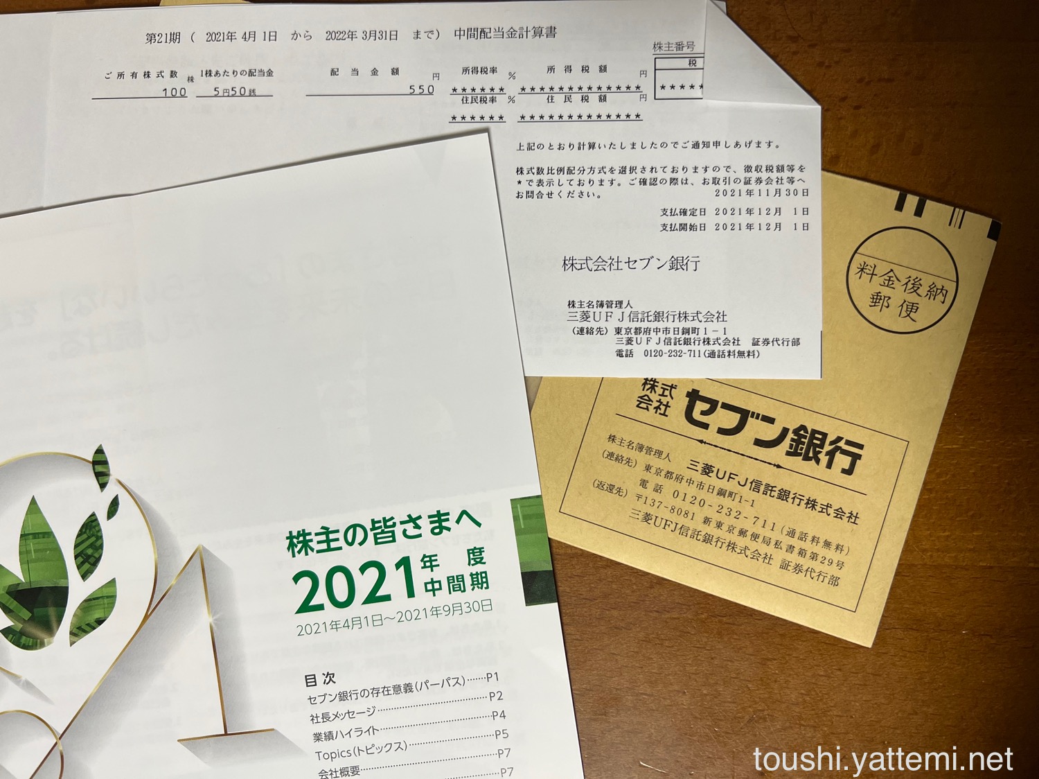 セブン銀行は、1株あたり5円50銭だったので、配当金は550円でした。