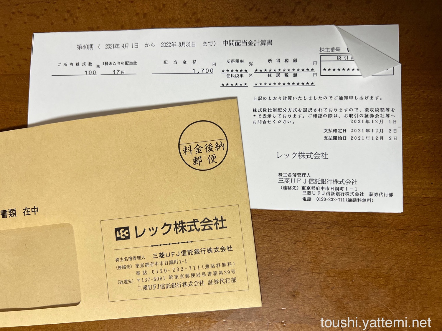 レックは、1株あたり17円だったので、配当金は1,700円でした。