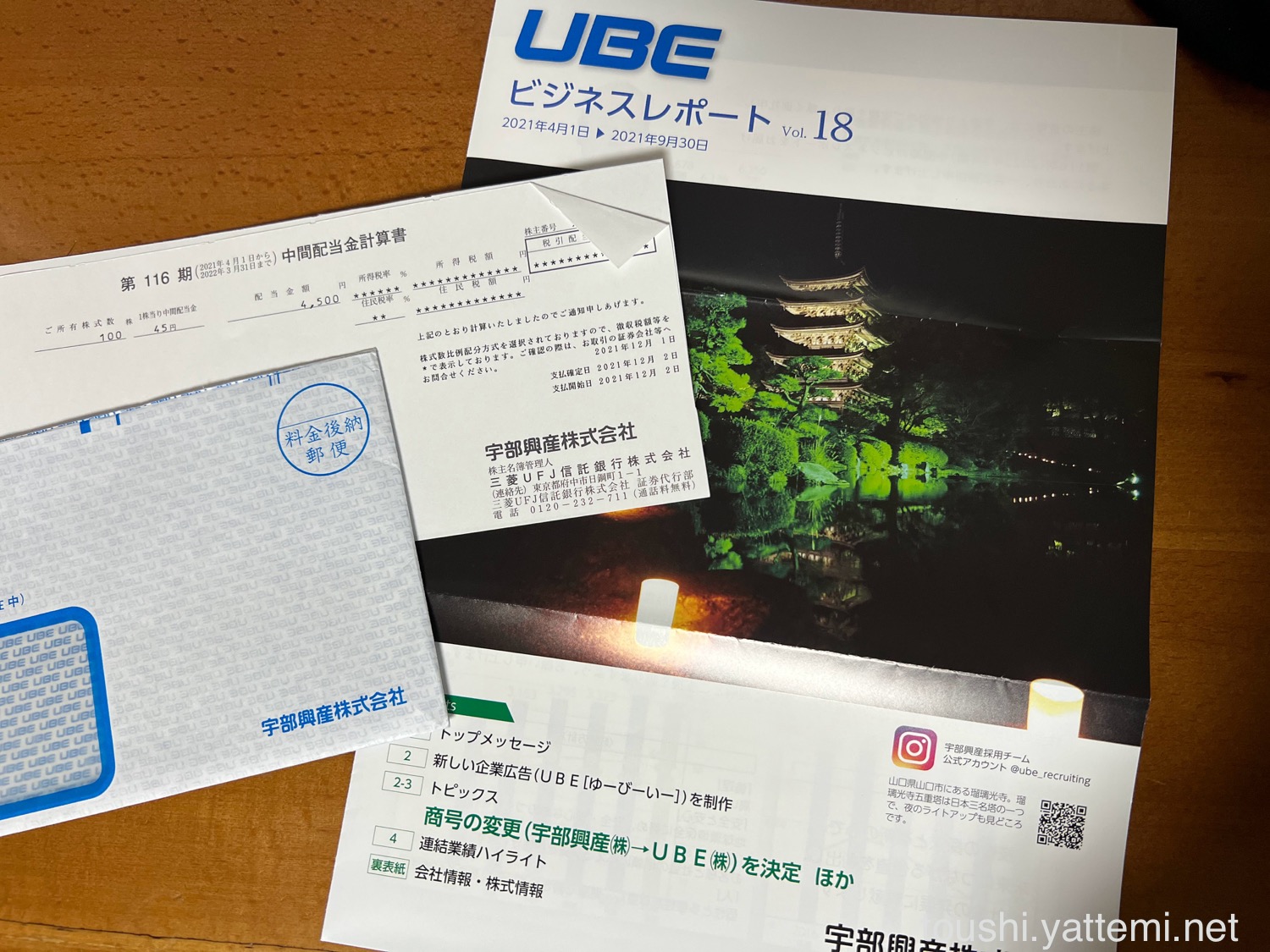 宇部興産は、1株あたり45円だったので、配当金は4,500円でした。