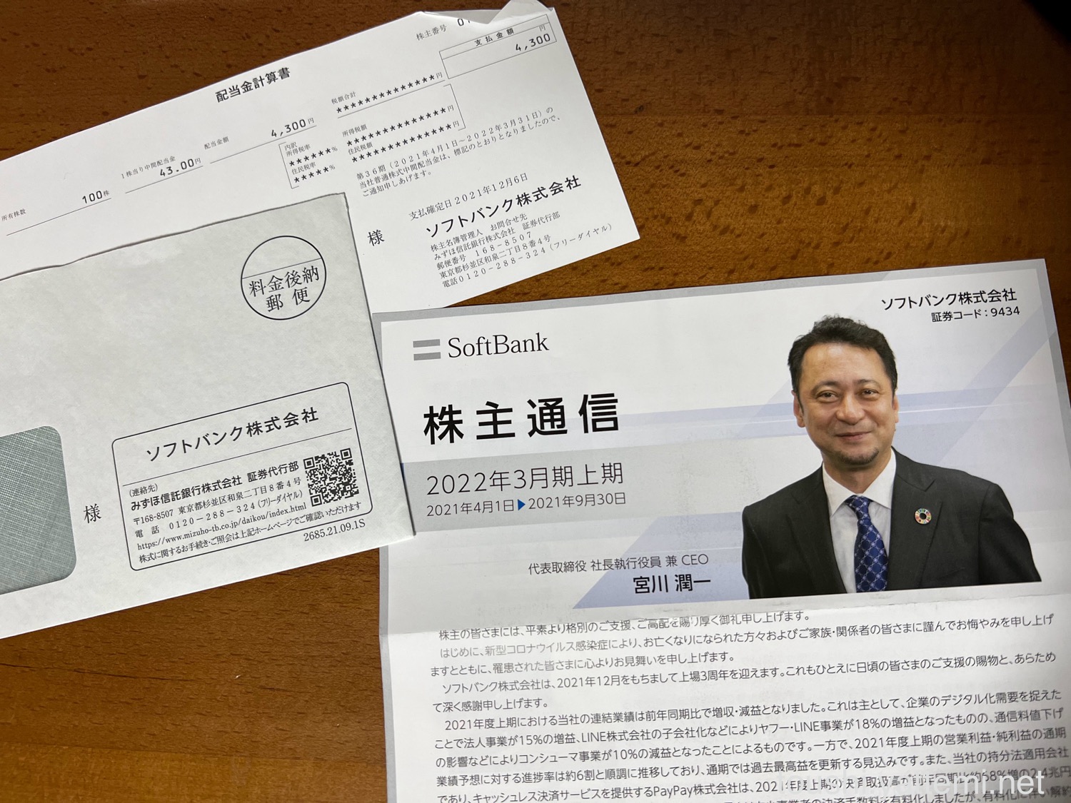 ソフトバンクは、1株あたり43円だったので、配当金は4,300円でした。