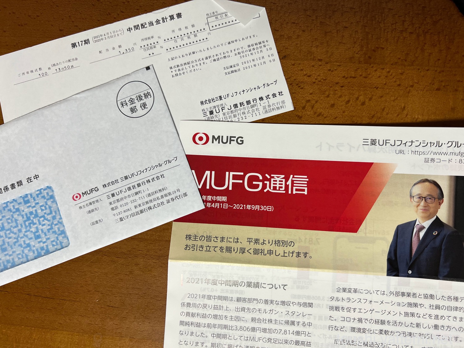 UFJは、1株あたり13円50銭だったので、配当金は1,350円でした。