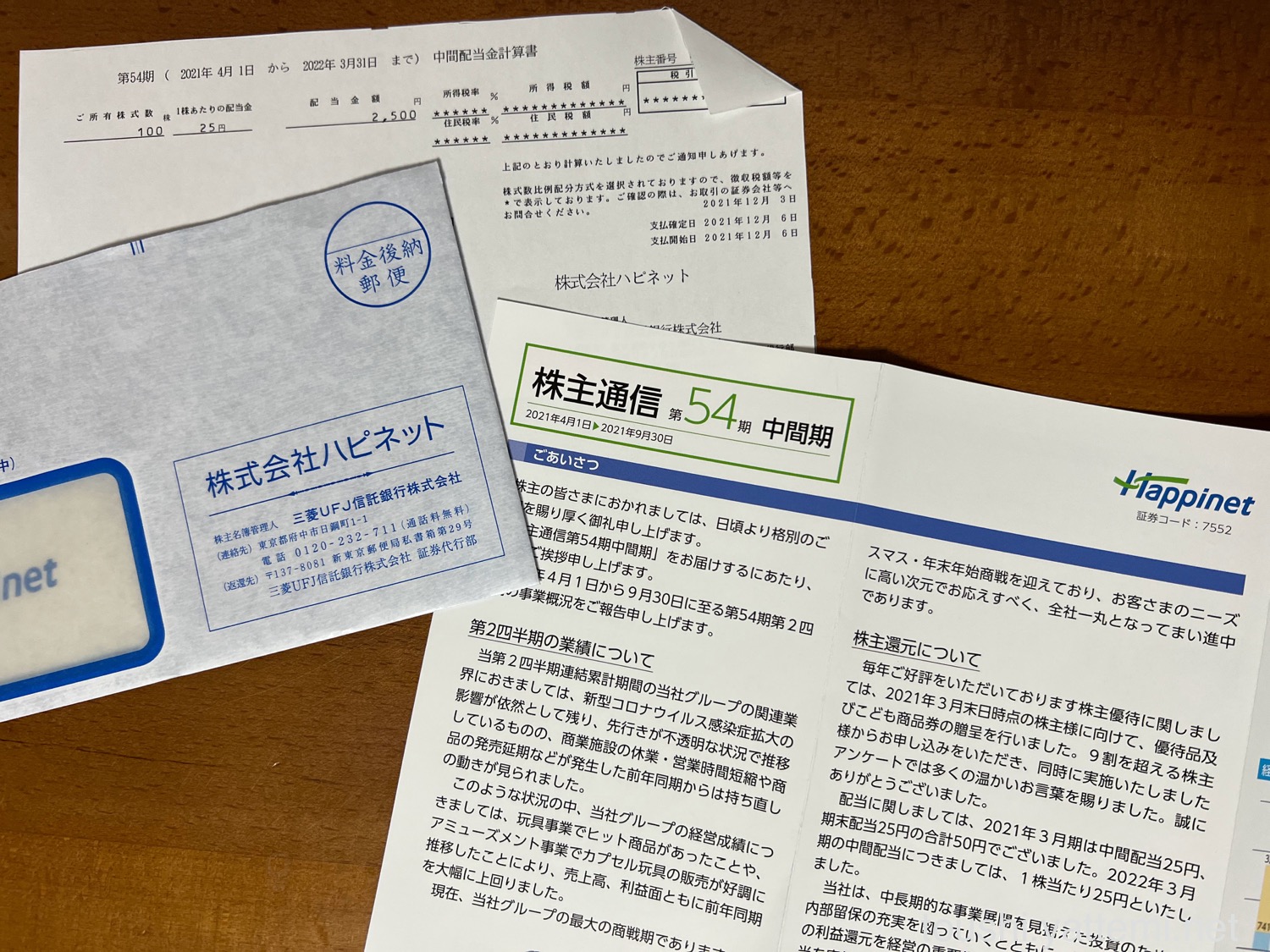 ハピネットは、1株あたり25円だったので、配当金は2,500円でした。