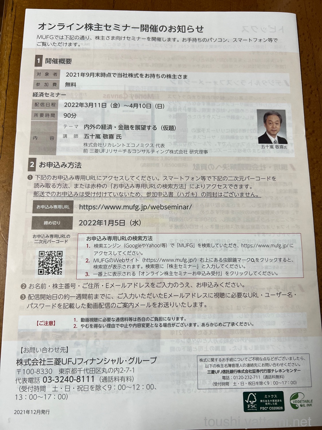 MUFG通信の裏側に、オンライン株主セミナーの案内がありました。