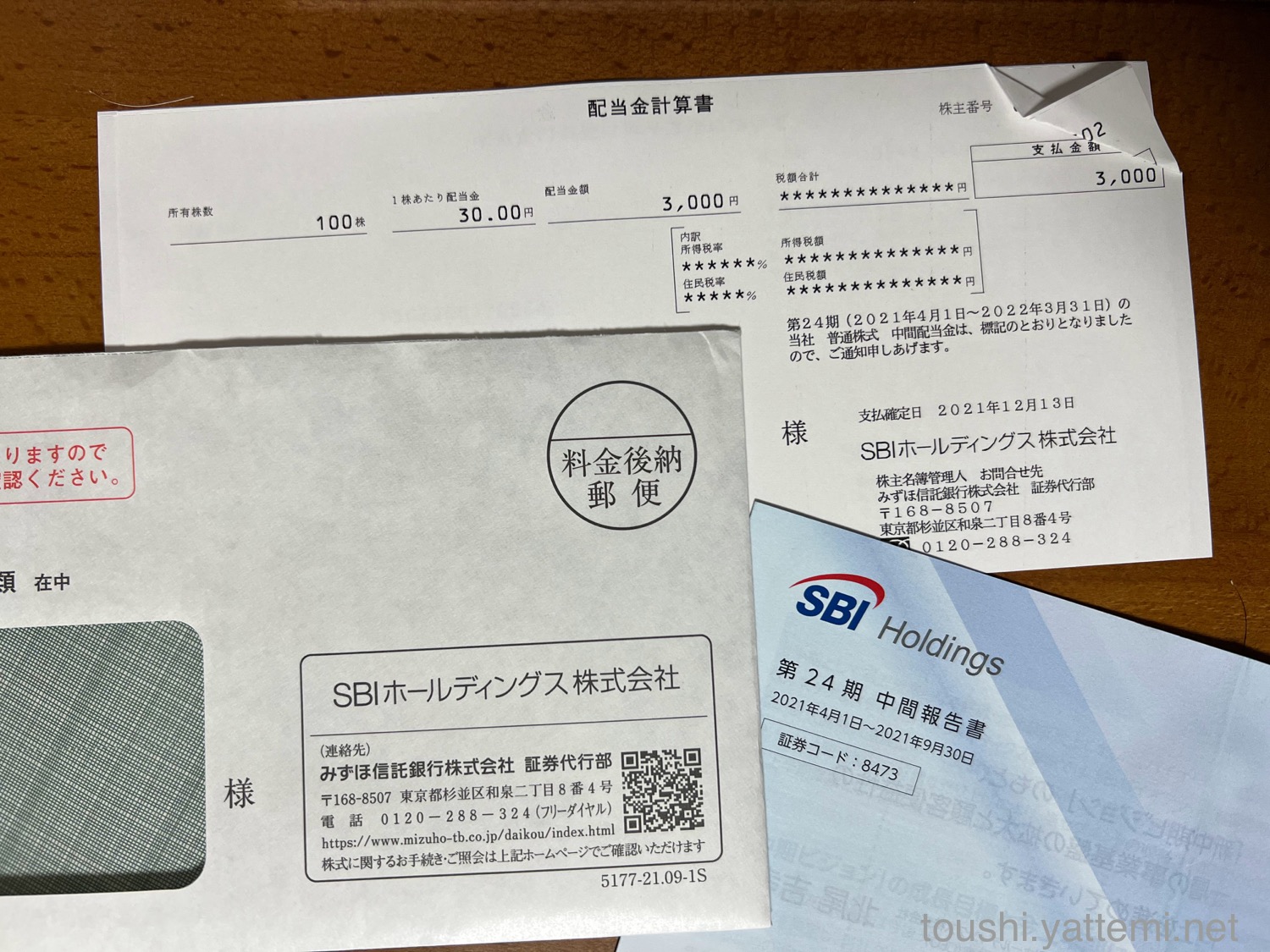 SBIホールディングスは、1株あたり30円だったので、配当金は3,000円でした。