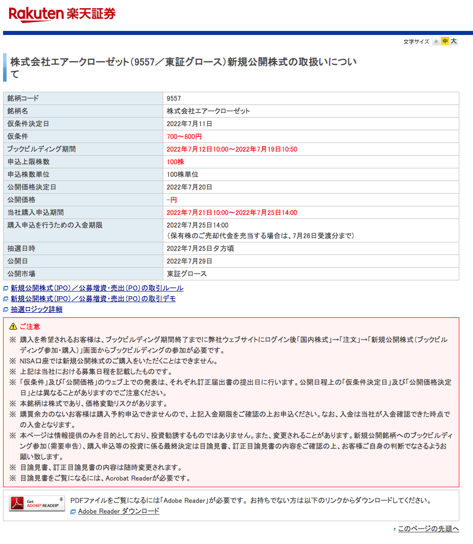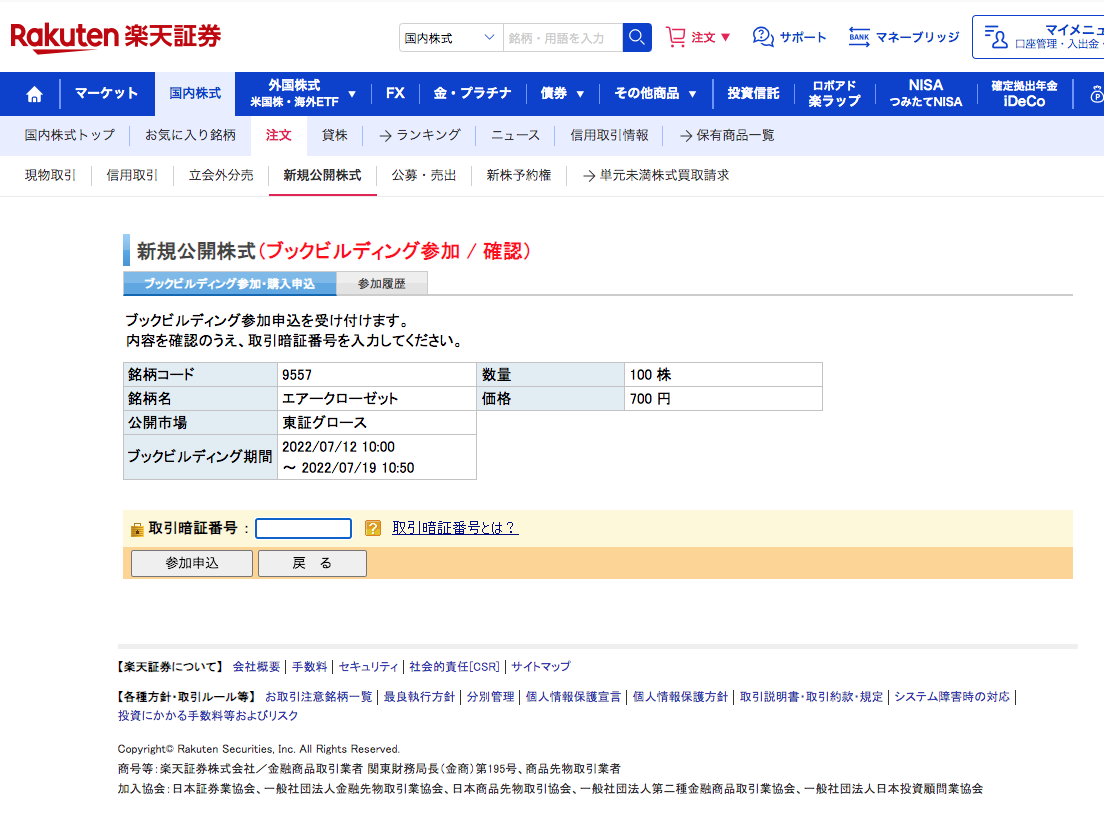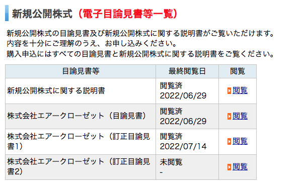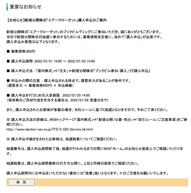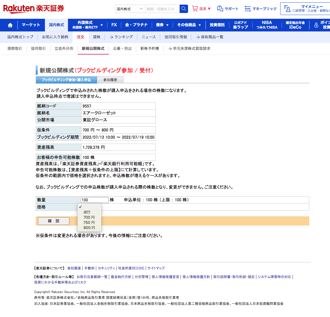 楽天証券の「新規公開株式」を見ていたら、以前何かで見かけた「ファッションサブスク airCloset(エアークローゼット)」が2022/07/29に東証グロース市場へ新規公開するので、初めてのブックビルディングに参加してみました。