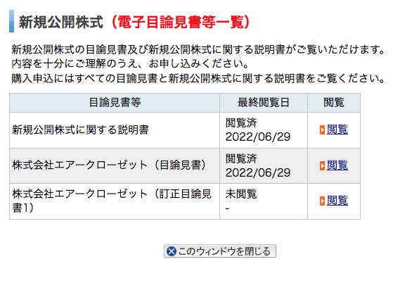 先程の「新規公開株式」一覧ページにある「目論見書」の「閲覧」をクリックすると