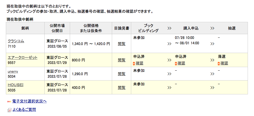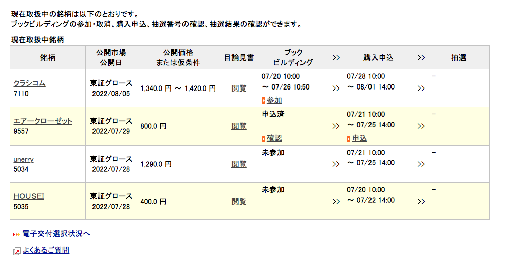 やったことは「スケジュールの確認」「目論見書の確認・同意」「ブックビルディング」「購入申込」「抽選」です。