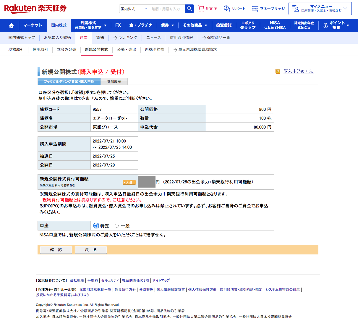 購入申込み画面に移動するので、内容を確認して、購入する口座を「特定」か「一般」か選択したら確認を押します。