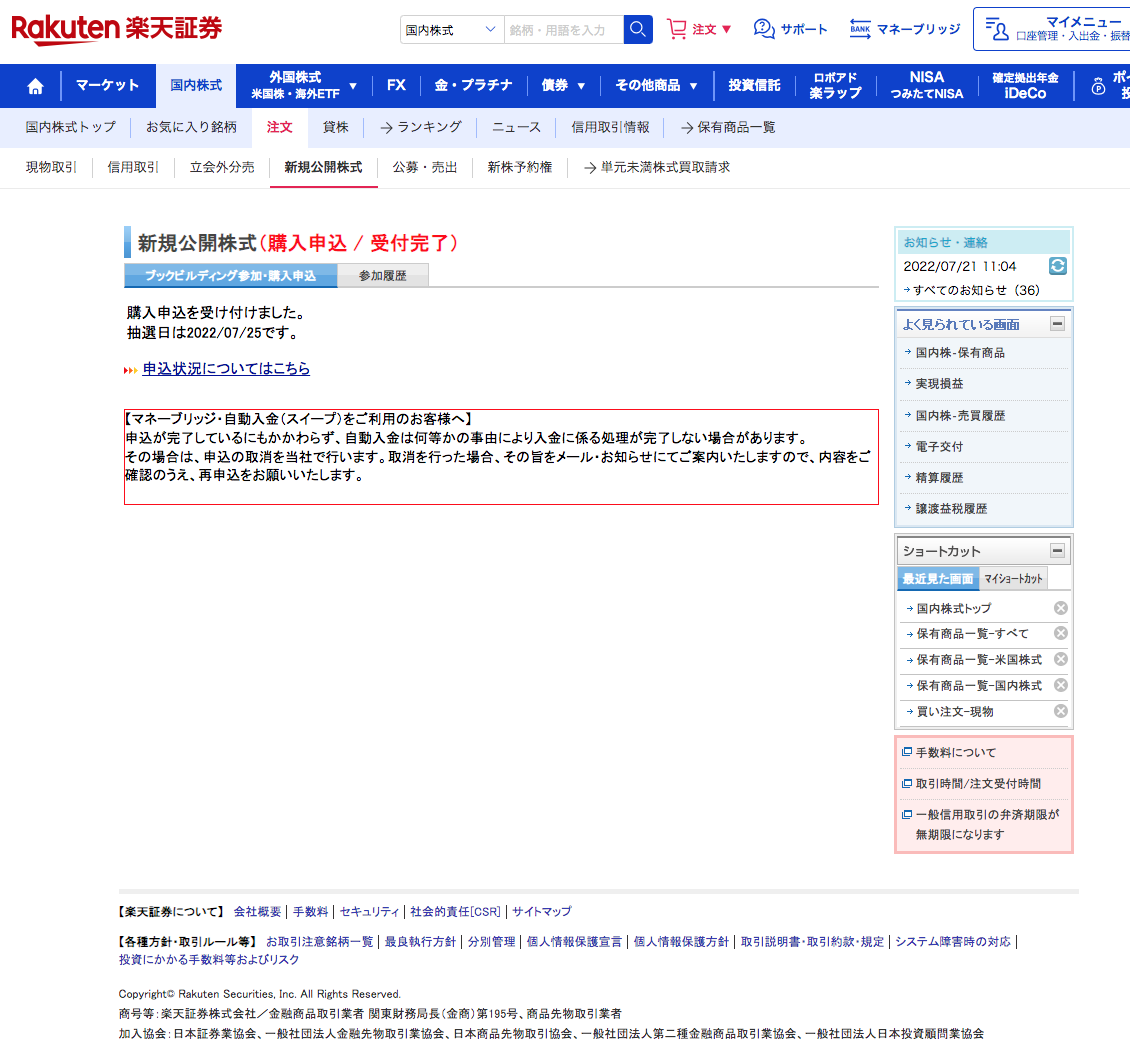これで無事「購入申込」が完了しました。抽選日は「2022/7/25」と表示されました。