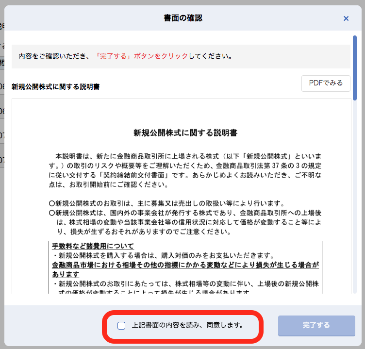これを確認して同意したら、チェックを入れて「完了する」をクリック。