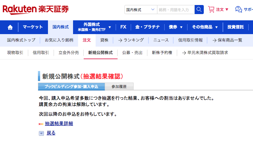 そもそも新規公開株式(IPO)の当選確率はとても低いようなので、購入できなかったのはしょうがないのですがとっても残念です。