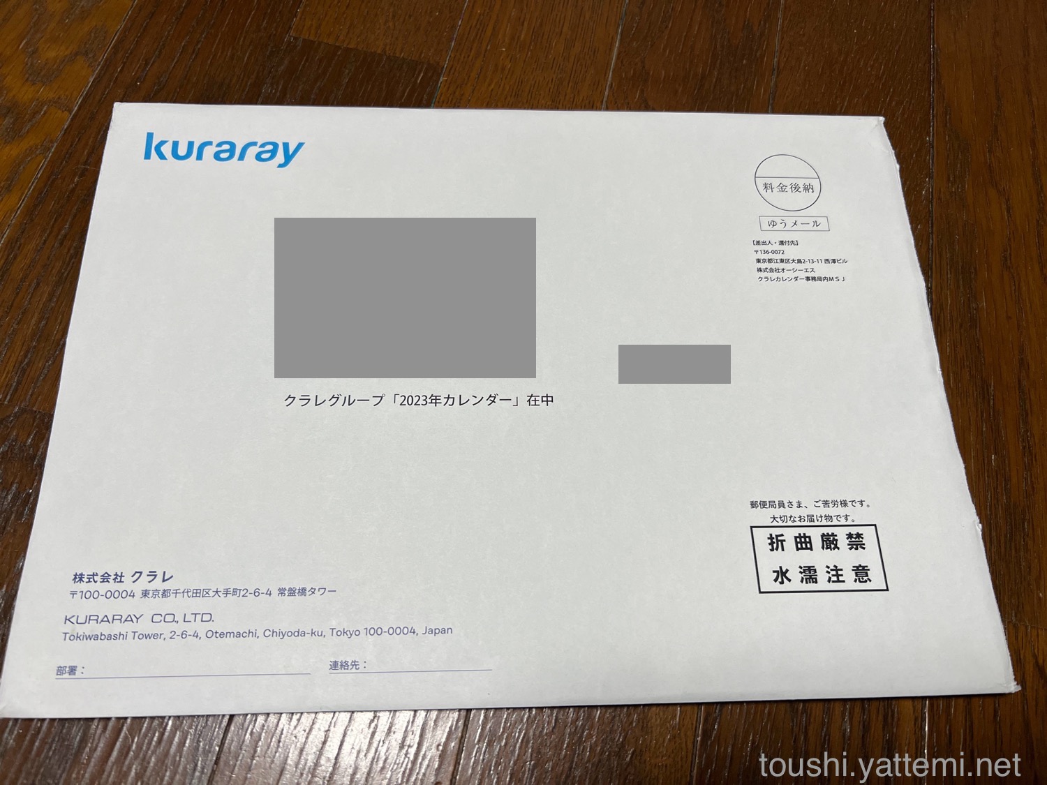申込みをしてから約2ヶ月、忘れた頃にクラレの封筒で届きました!