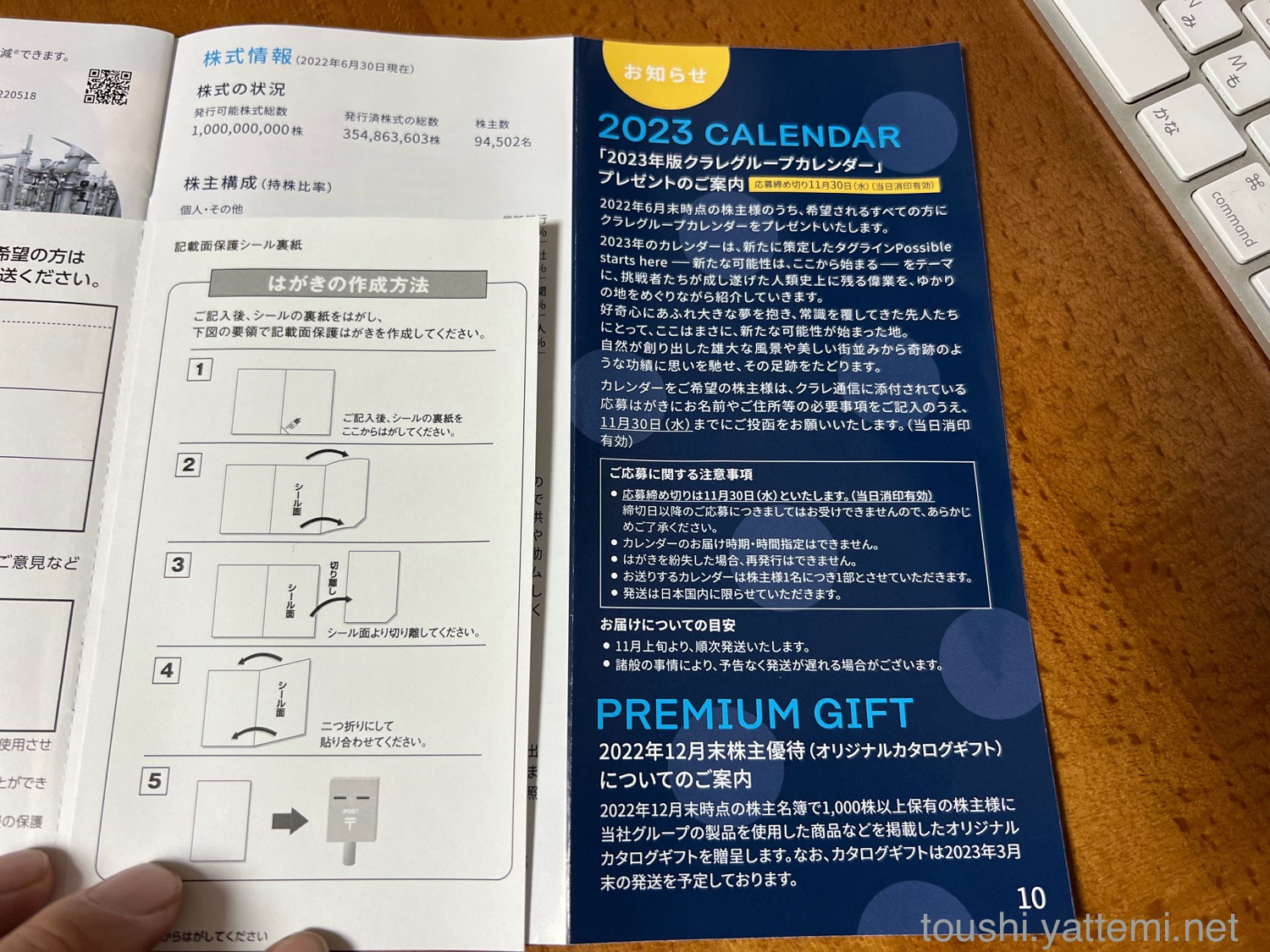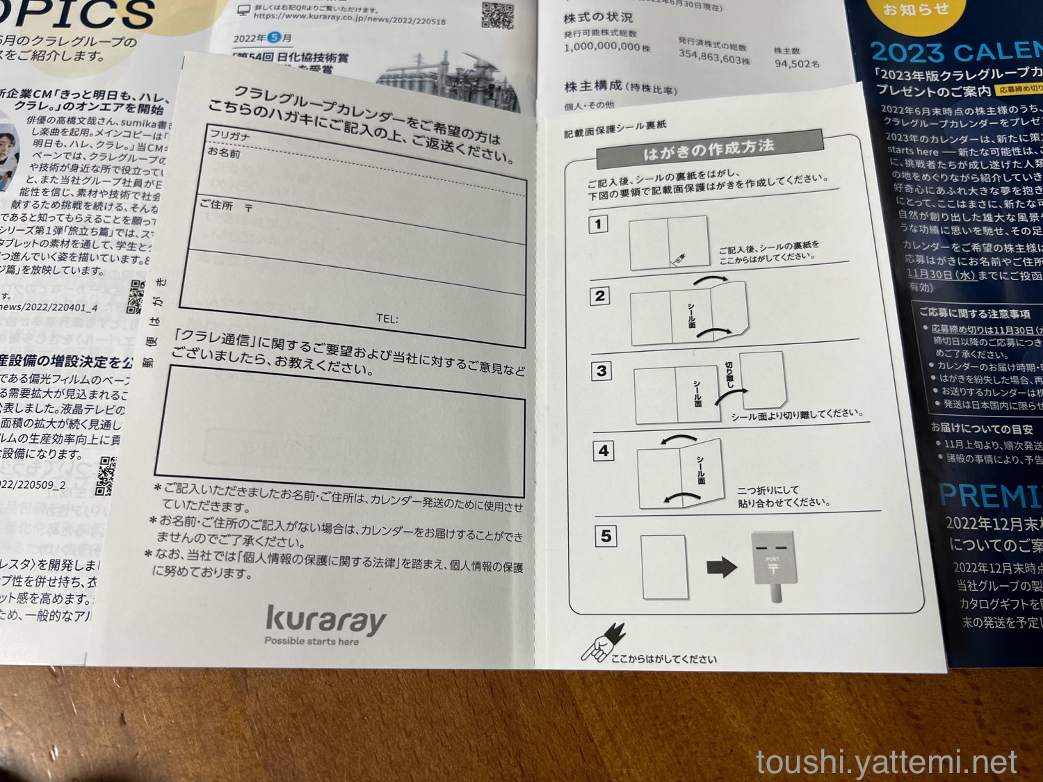 オリジナルカレンダーの申込みは、9月頭に届いた「クラレ通信(142期 報告書)」の中に入っているはがきを送って、11月中旬に届きました。