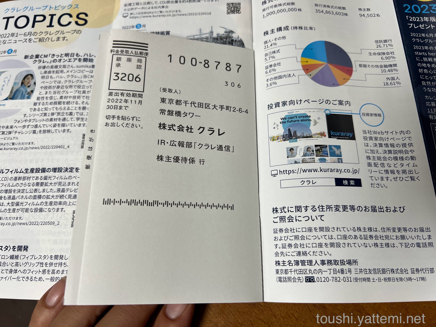 後半の方に「株式情報」が載っていて、株主優待の「2023年版クラレグループカレンダー」とオリジナルカタログギフトの情報が出ています。