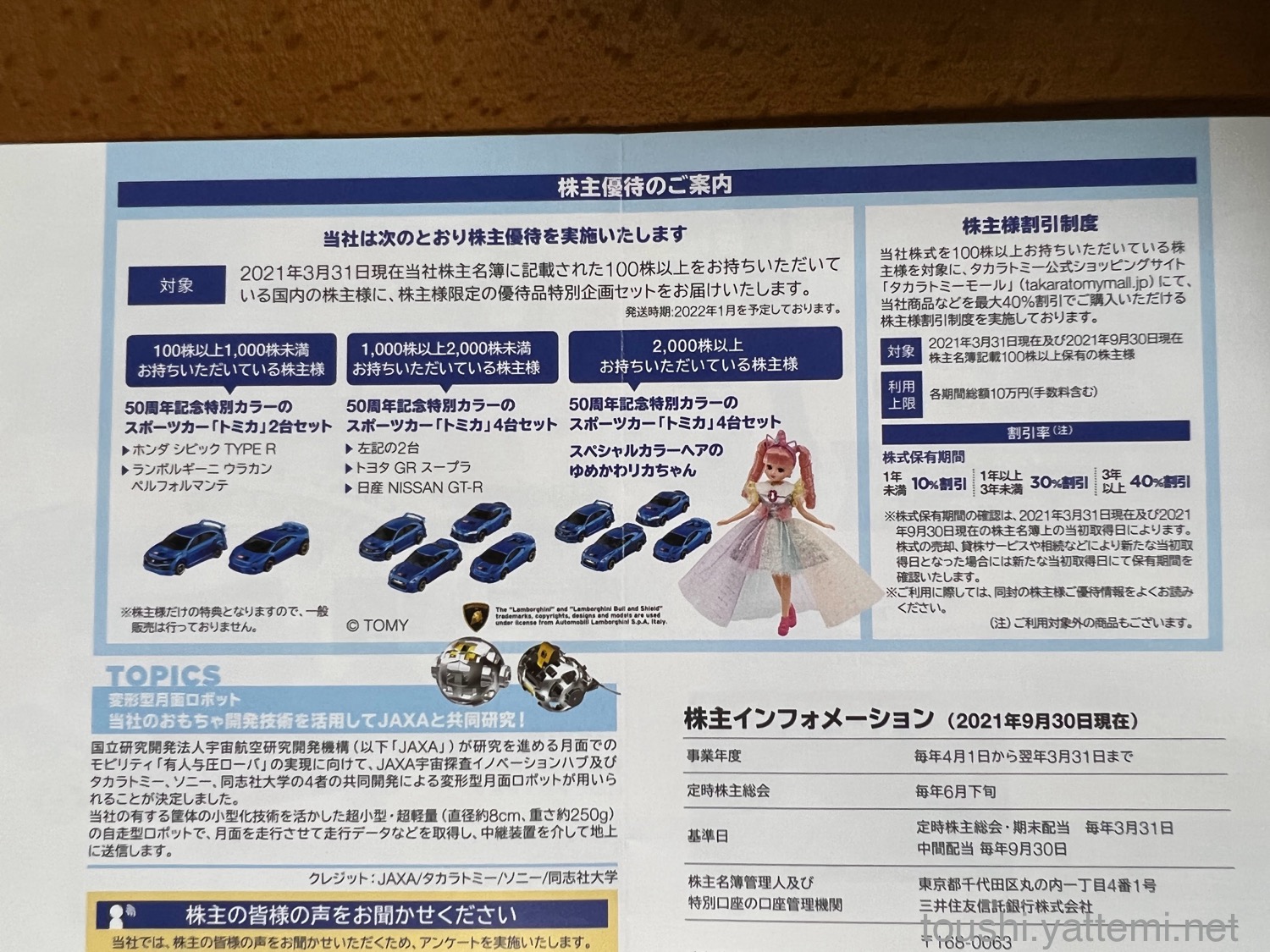 リカちゃんは2,000株以上なので、まだまだ手が届かないのですが、、特別カラーのトミカ2台は100株以上でもらうことができます!