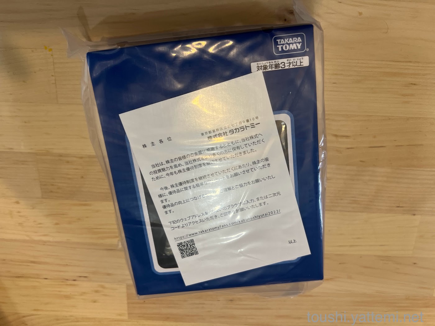 1単元しか株式を持っていないので、いつも「トミカ」2台セットですが、いづれは1,000株以上2,000株未満で保有して、「トミカ」4台セットがほしいですねぇ〜!