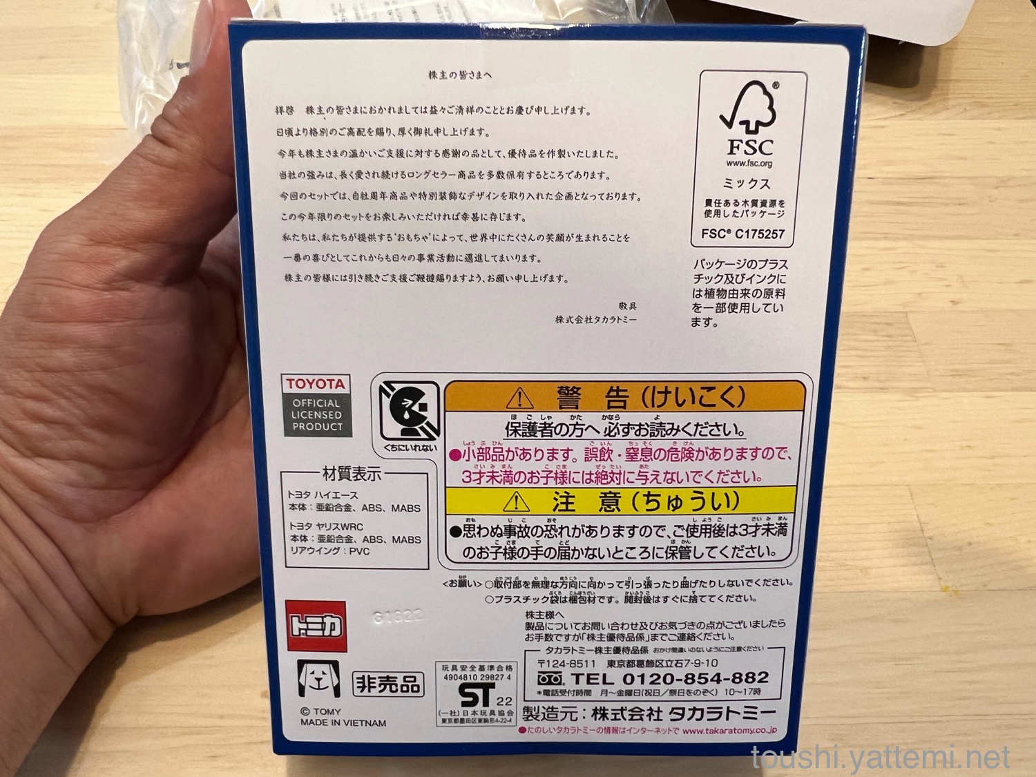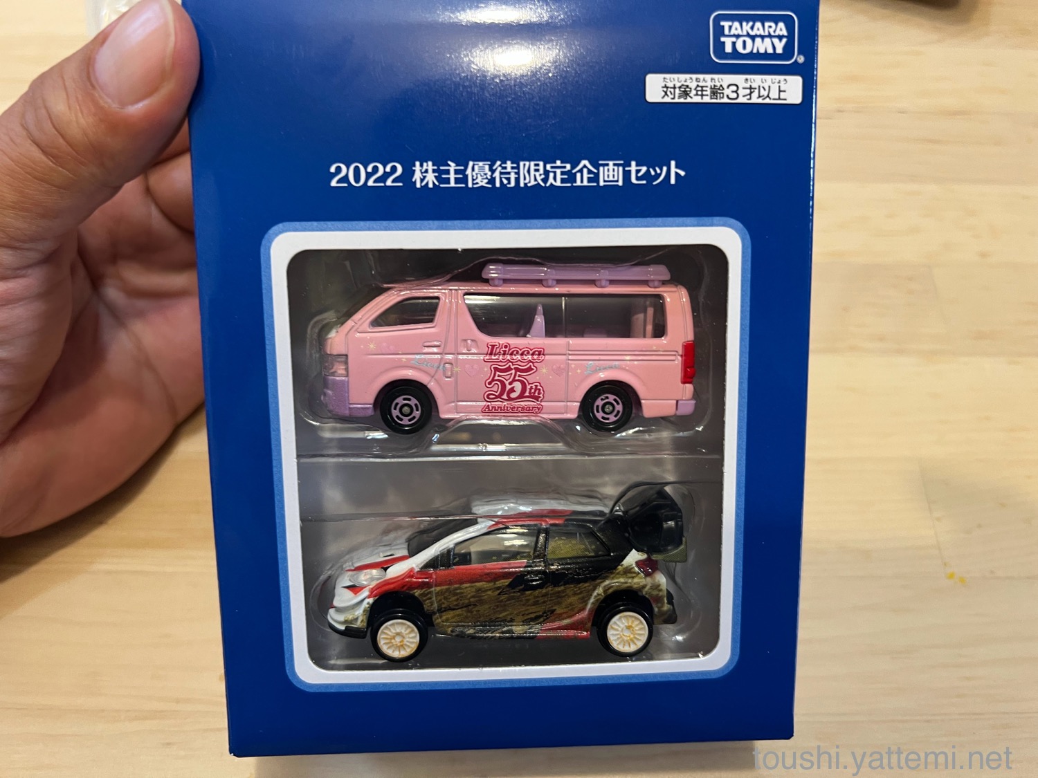 タカラトミー(7867)の株主優待で、「トヨタ ヤリスWRC」と「トヨタ ハイエース」のトミカをもらいました。