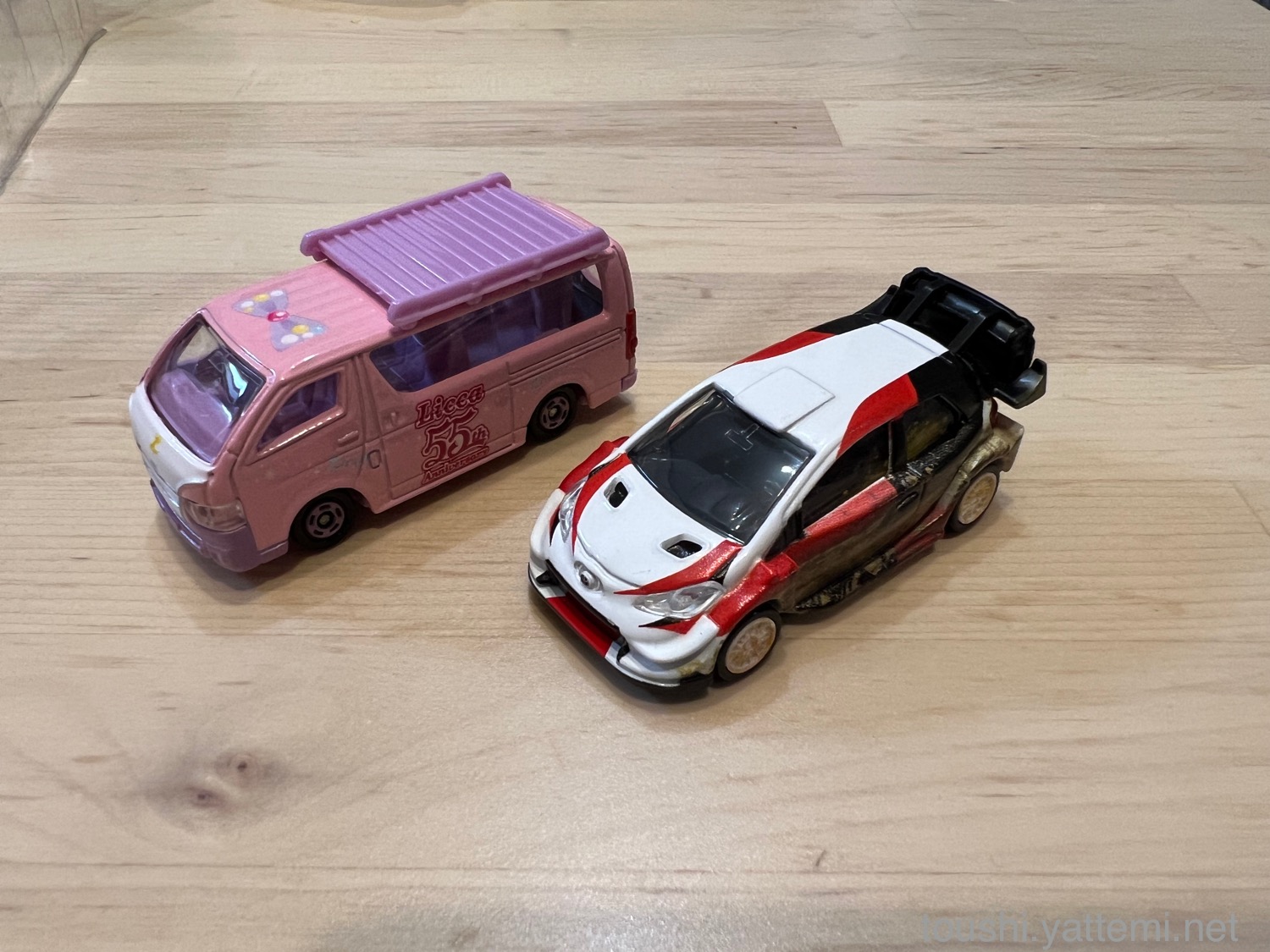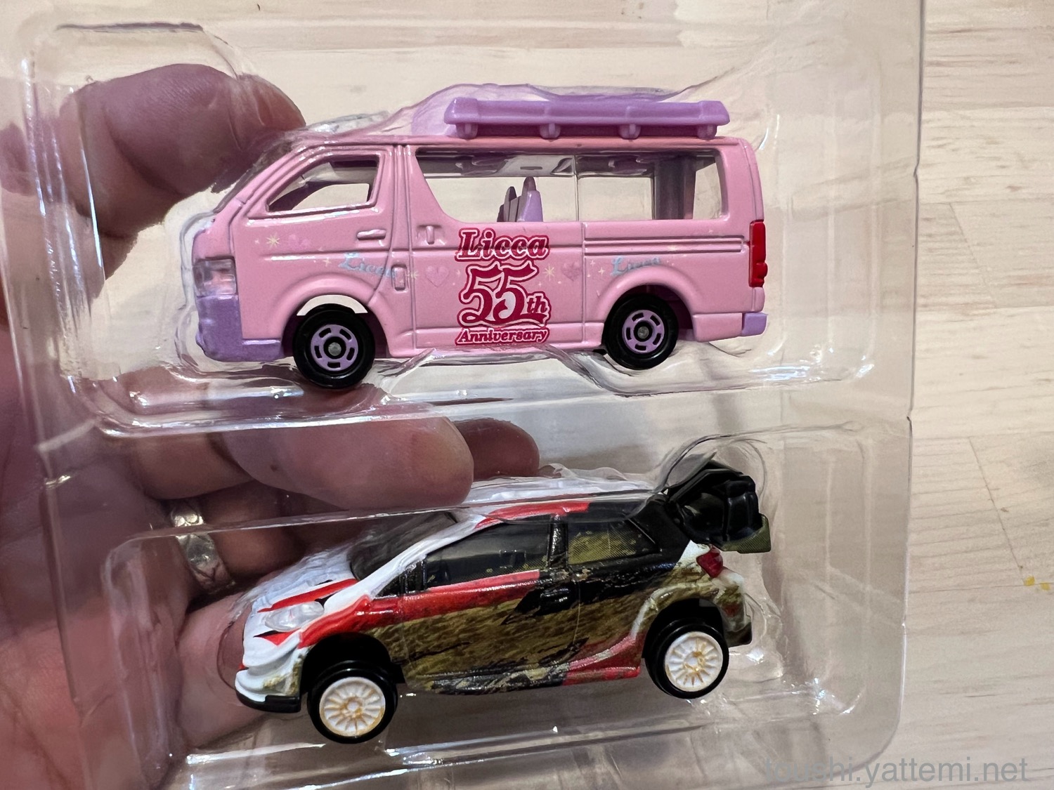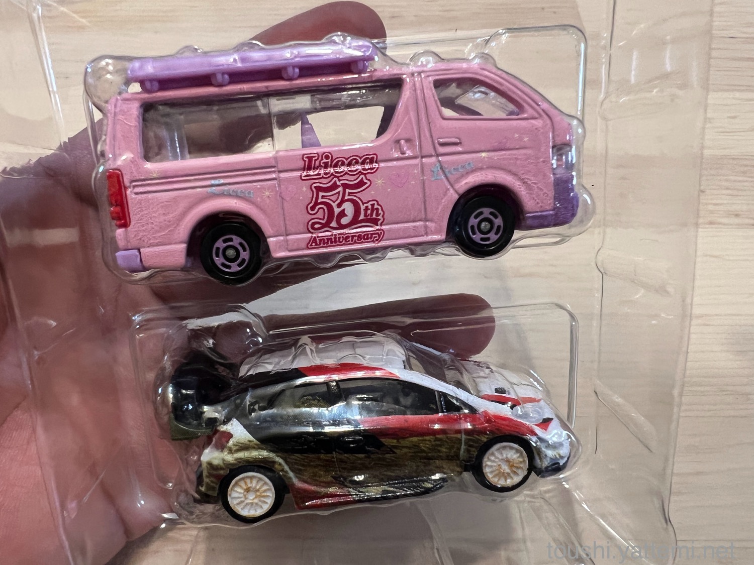 中の袋を開けると、「トヨタ ハイエース(リカちゃん55周年デザイン)」と「トヨタ ヤリスWRC」が見れました。