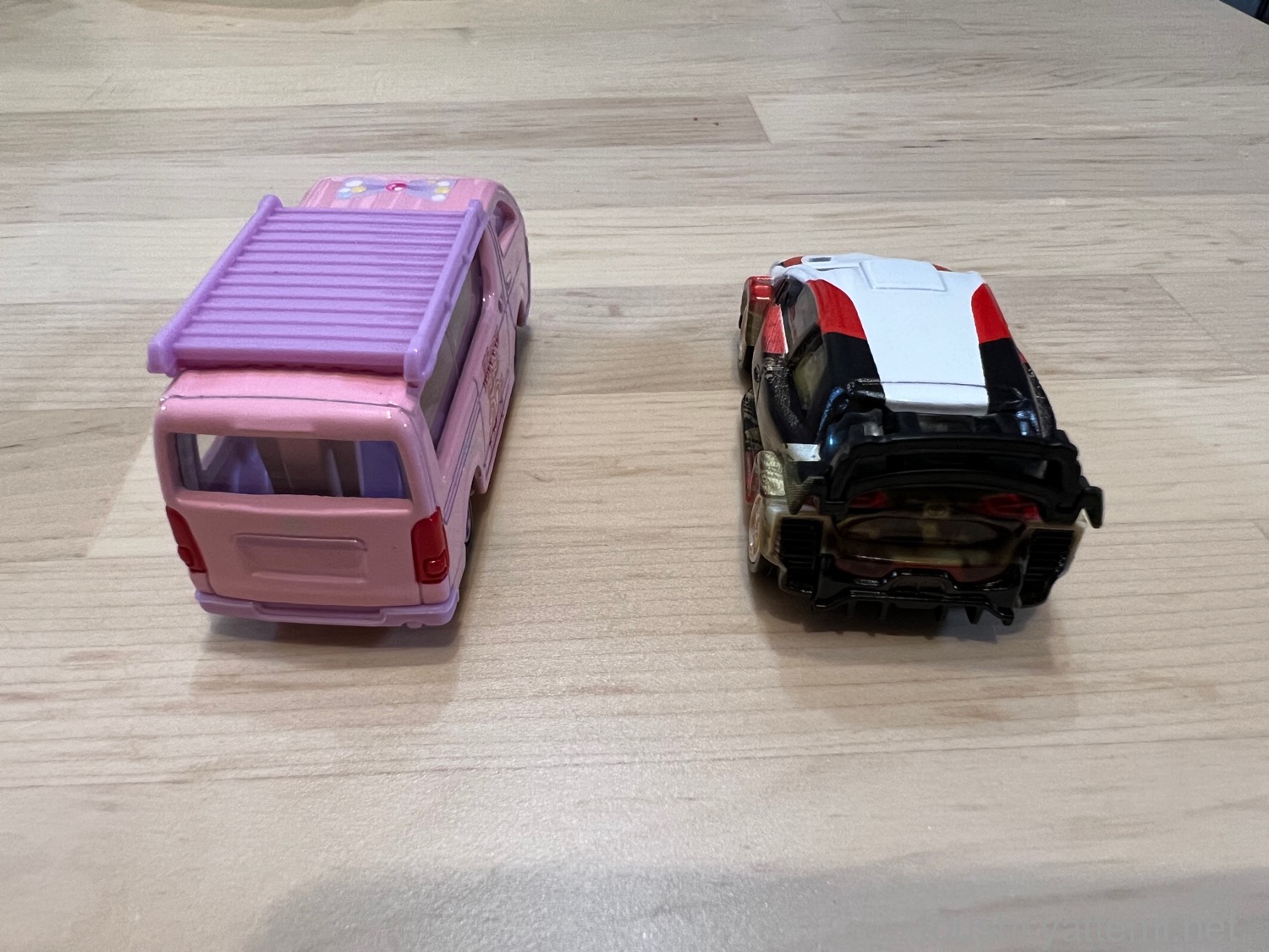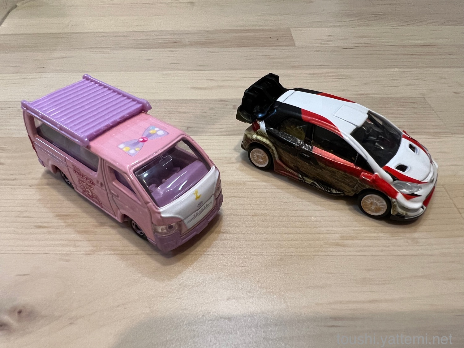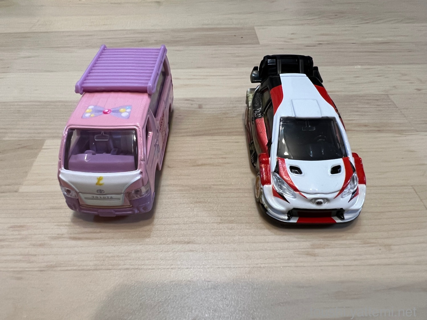 中の袋を開けると、「トヨタ ハイエース(リカちゃん55周年デザイン)」と「トヨタ ヤリスWRC」が見れました。