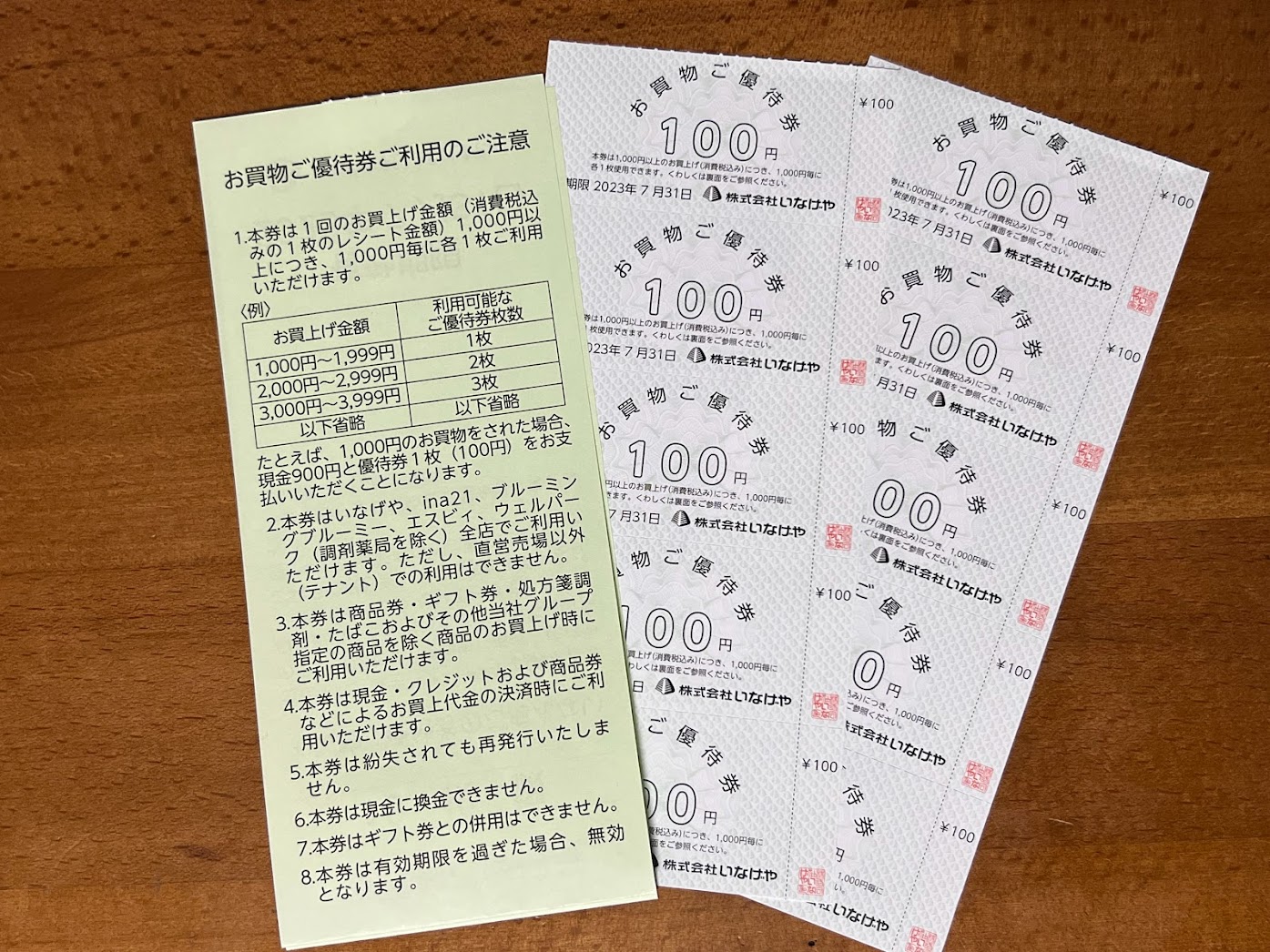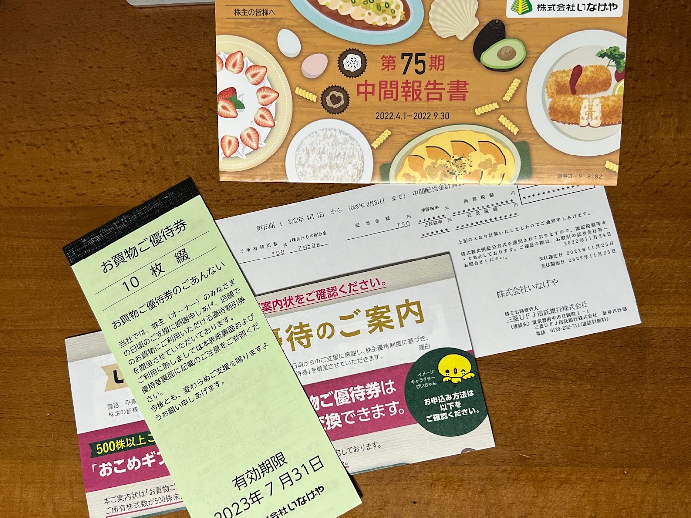 いなげや(8182)の株主優待で、配当金の明細と2023年7月31日まで利用できる「お買い物ご優待券」が届きました。