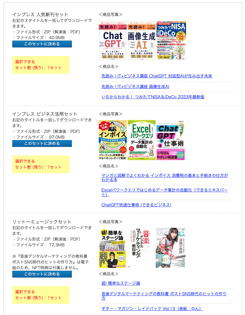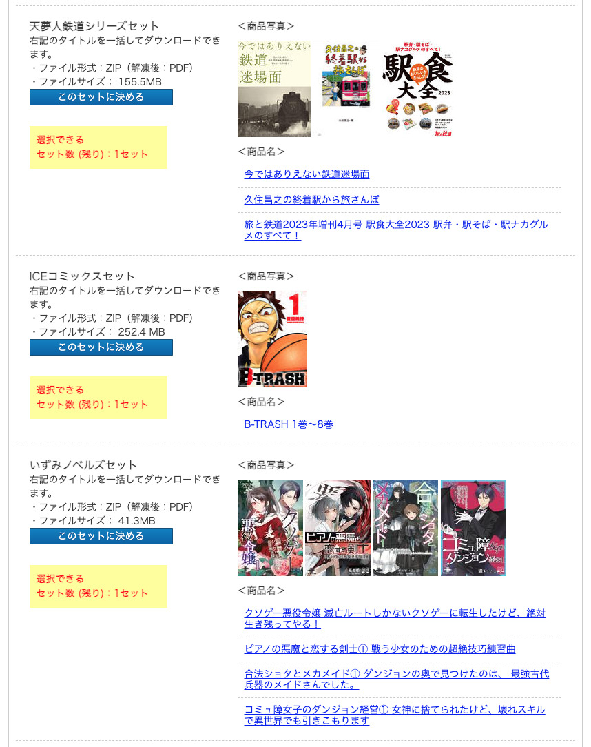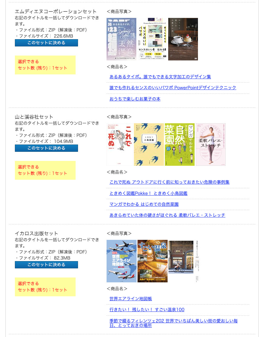 「電子出版物セット」は、10セットの中から選択できるのですが、セットによって1タイトルから8タイトル入っていて、普通に購入しようとすると合計して5,6千円分になるので結構良いです。