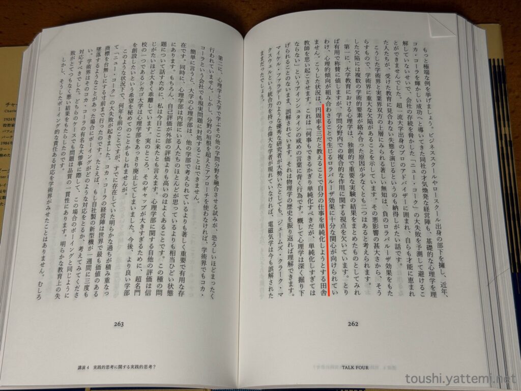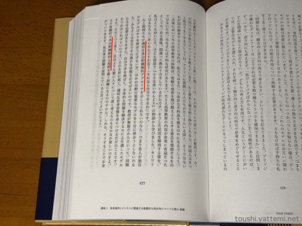 また最後に「講演11 誤判断の心理学」として、100ページ超にまとめられているところから、心理学に関した部分で「金づち人間」と考えられることが多いと、マンガーさんは考えていたようです。