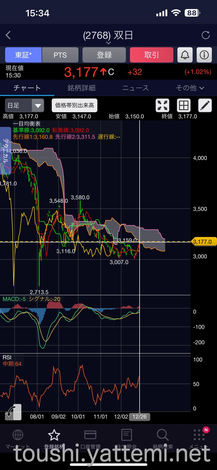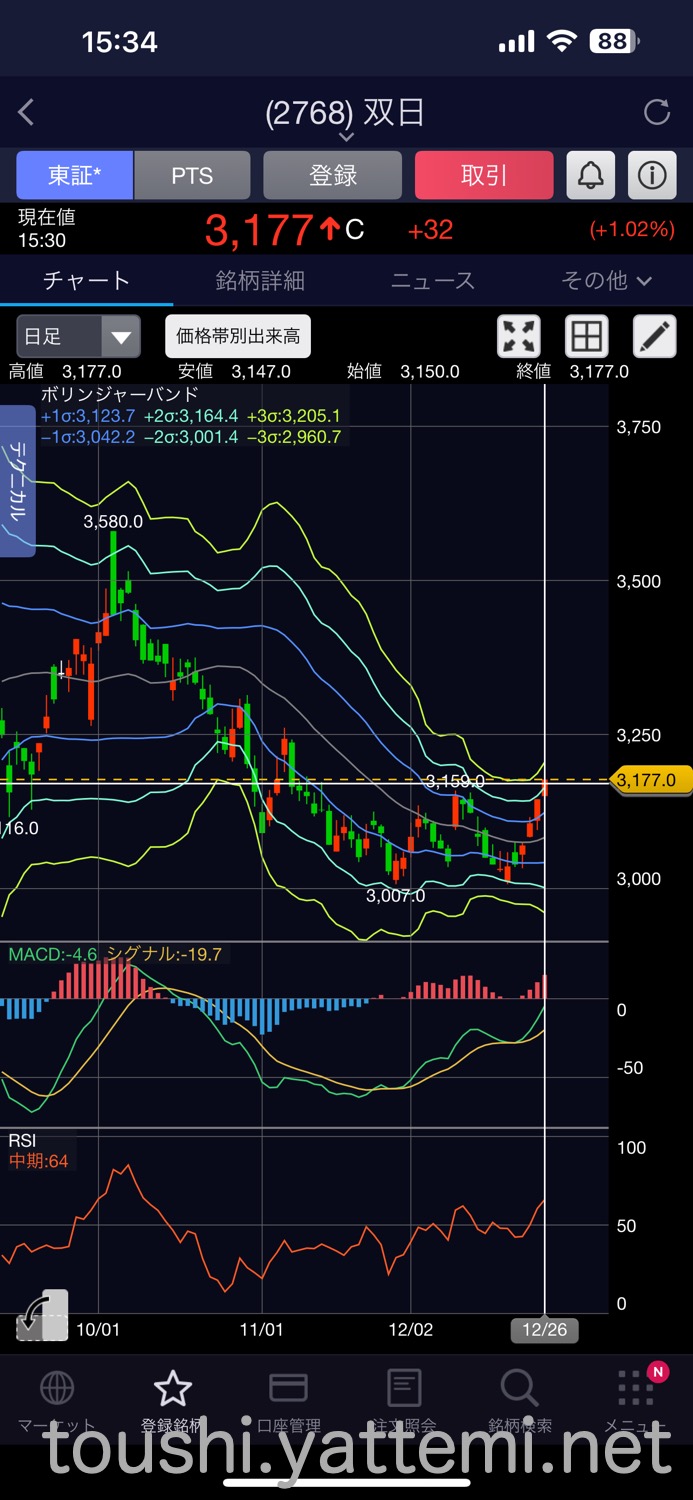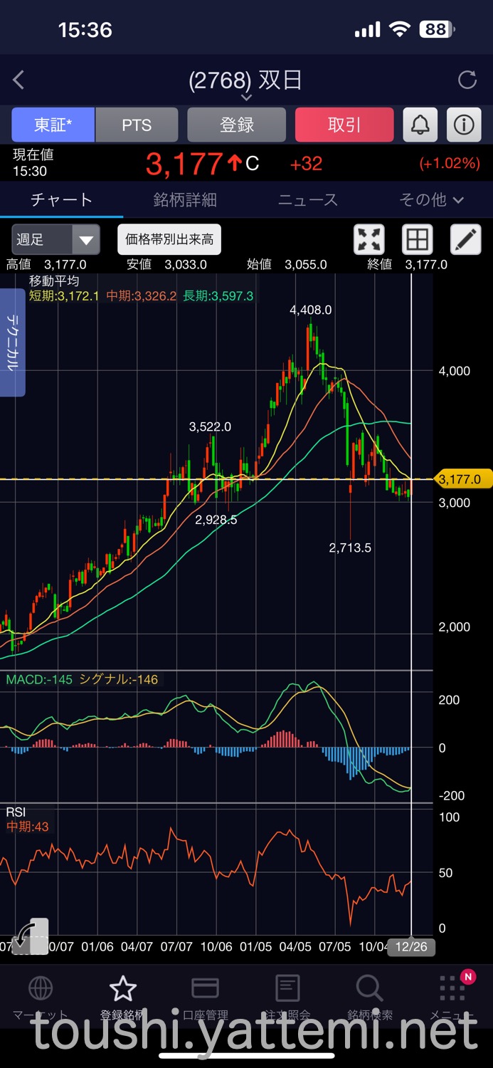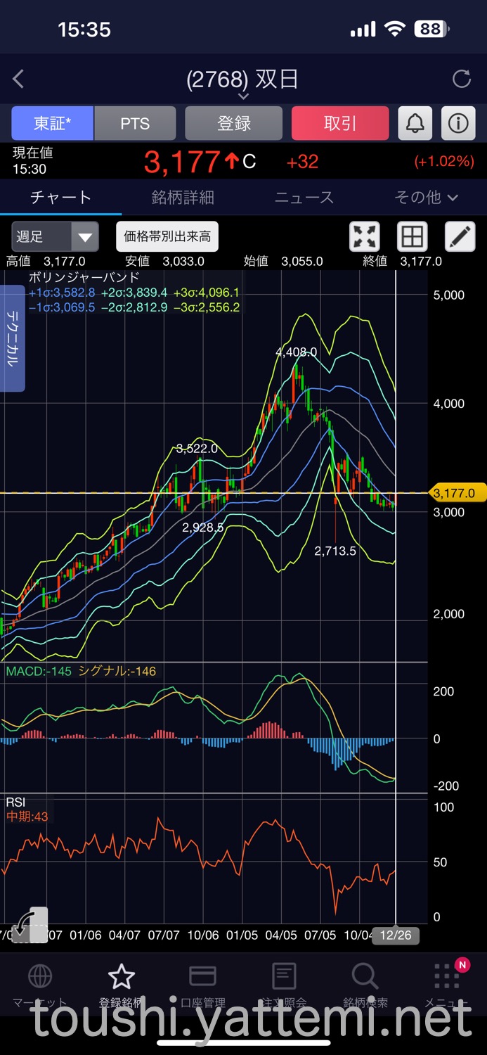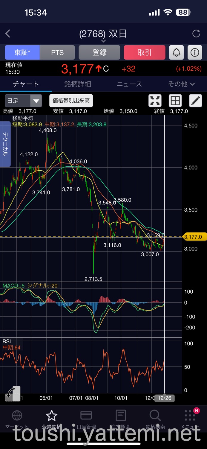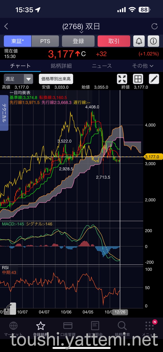 ずっと気になっていた5大商社ですが、年末の最終受渡日の12月26日にあえて5大商社じゃない双日(2768)を購入しました。