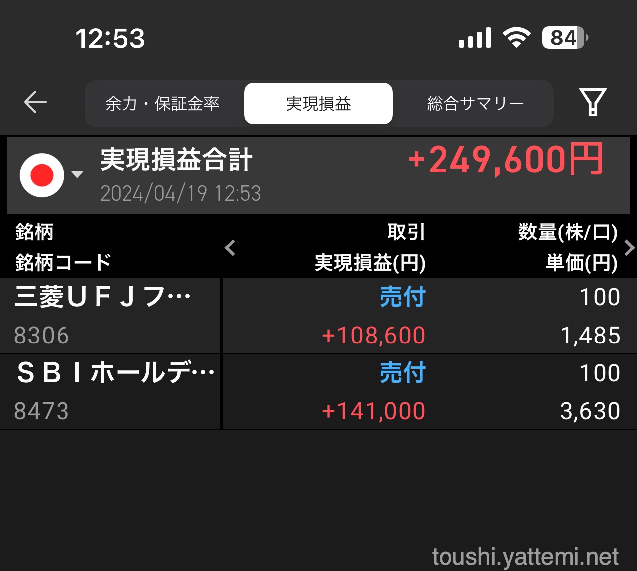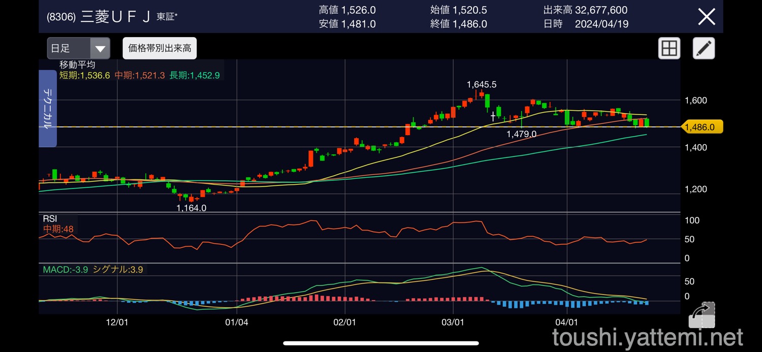 - 三菱UFJ 1,485円で売却(含み益:108,600円)