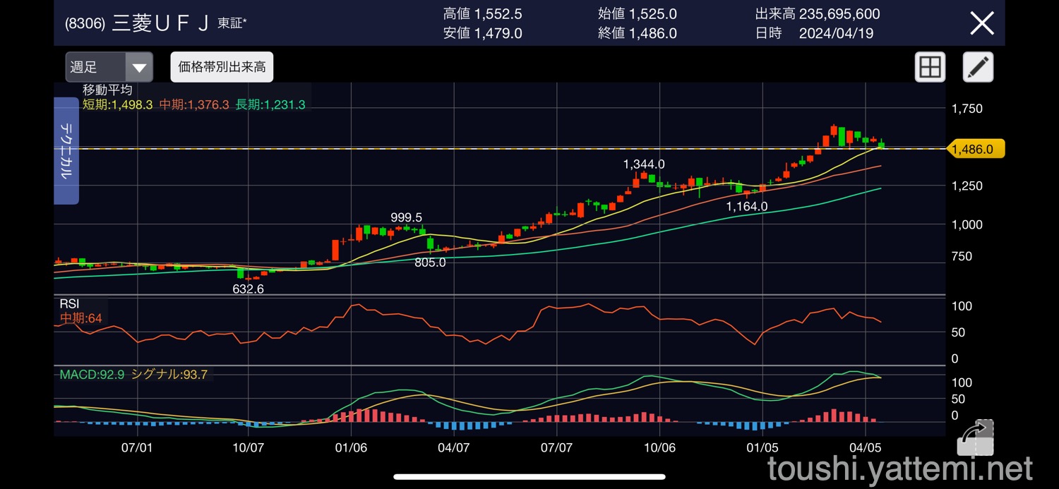 UFJはかなり割安で購入できていて、トリプルバーガーにはなっているのですが、2024年3月の1,600円台になった時に4倍株になっていたときが売りどきだったかなぁ〜。