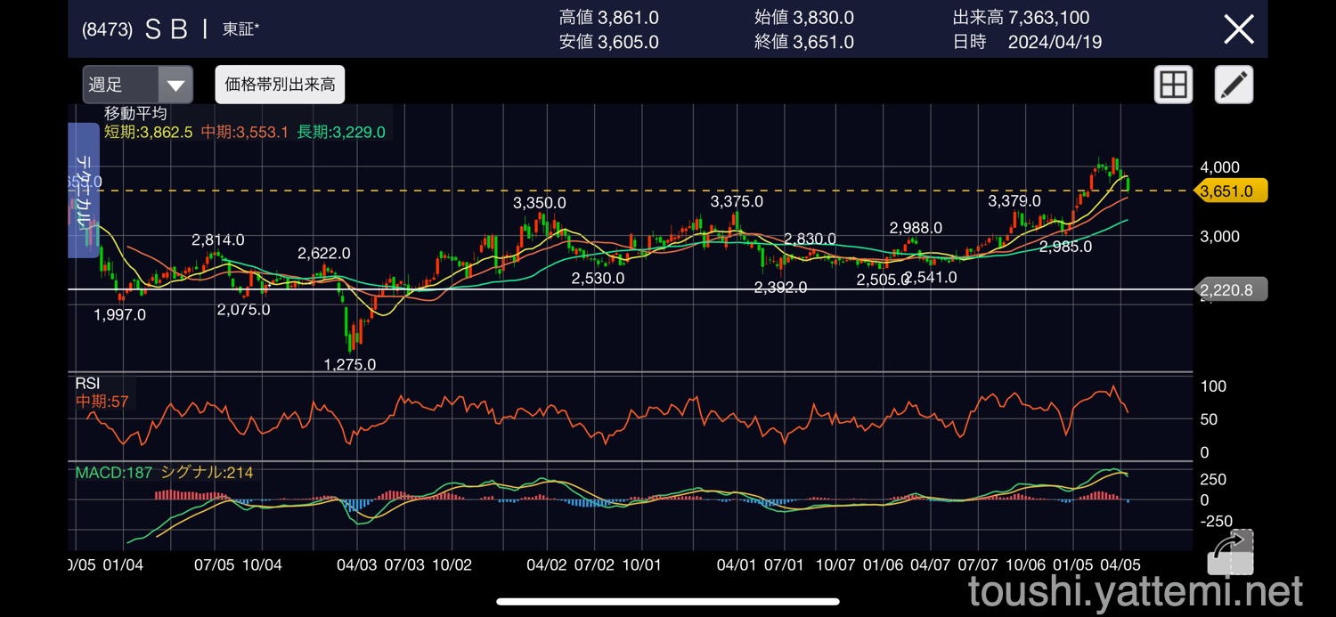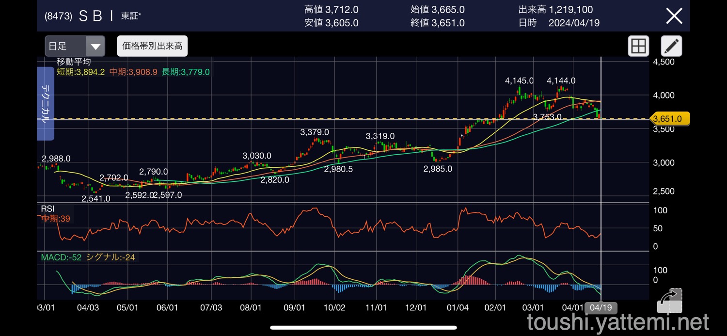 - SBIホールディングス 3,630円で売却後、3,852円(逃した利益:22,200円)
