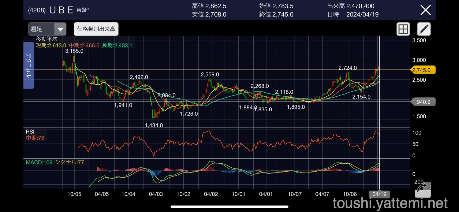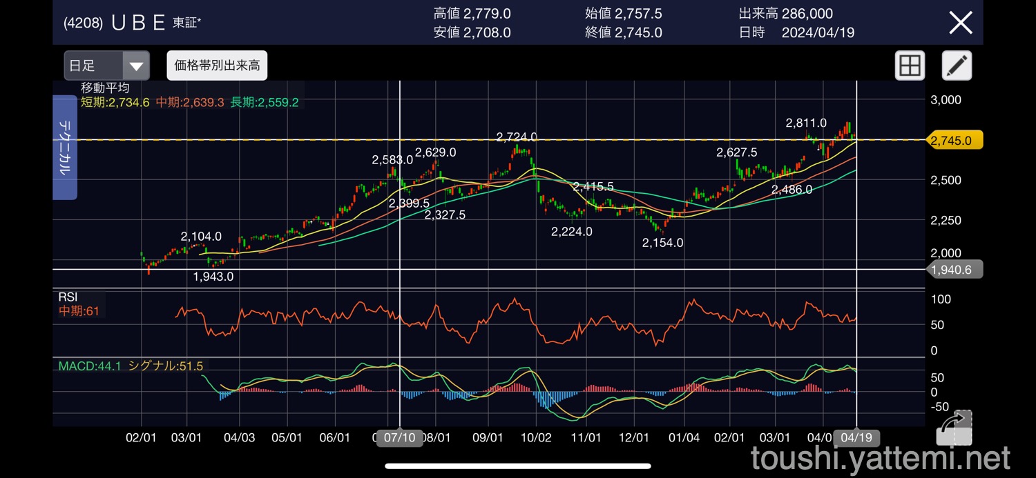 UBEは、週足MACDを見ているとまだ上がるかもだったのですが、日足で下がりかけだから利益確定でいいか!ってことにしました。
