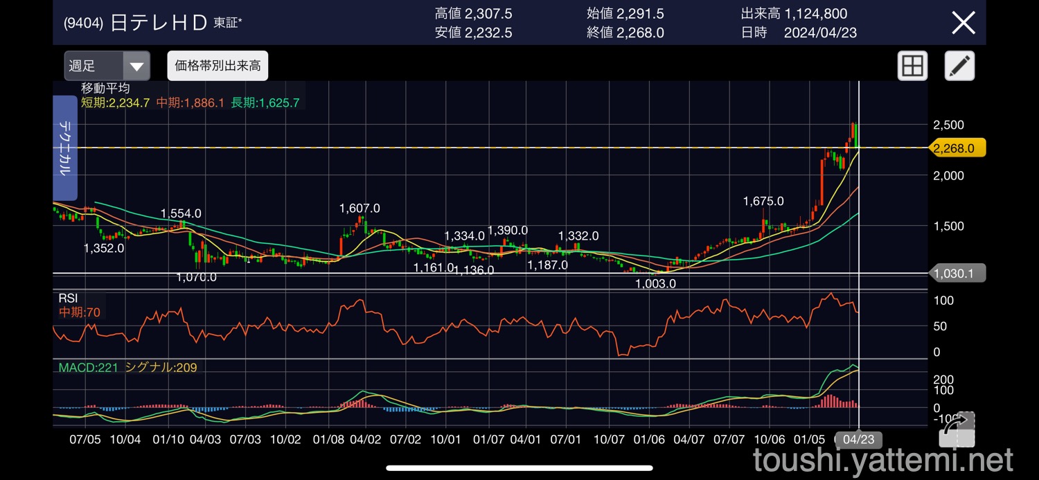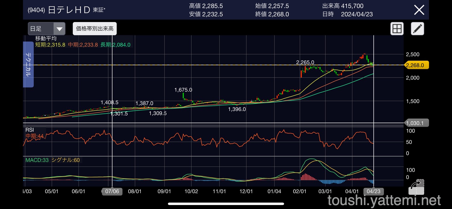 それなりの利益を取ることはできたのですが、次は「テレ東HD(9413)」のほうが良さそうかな。